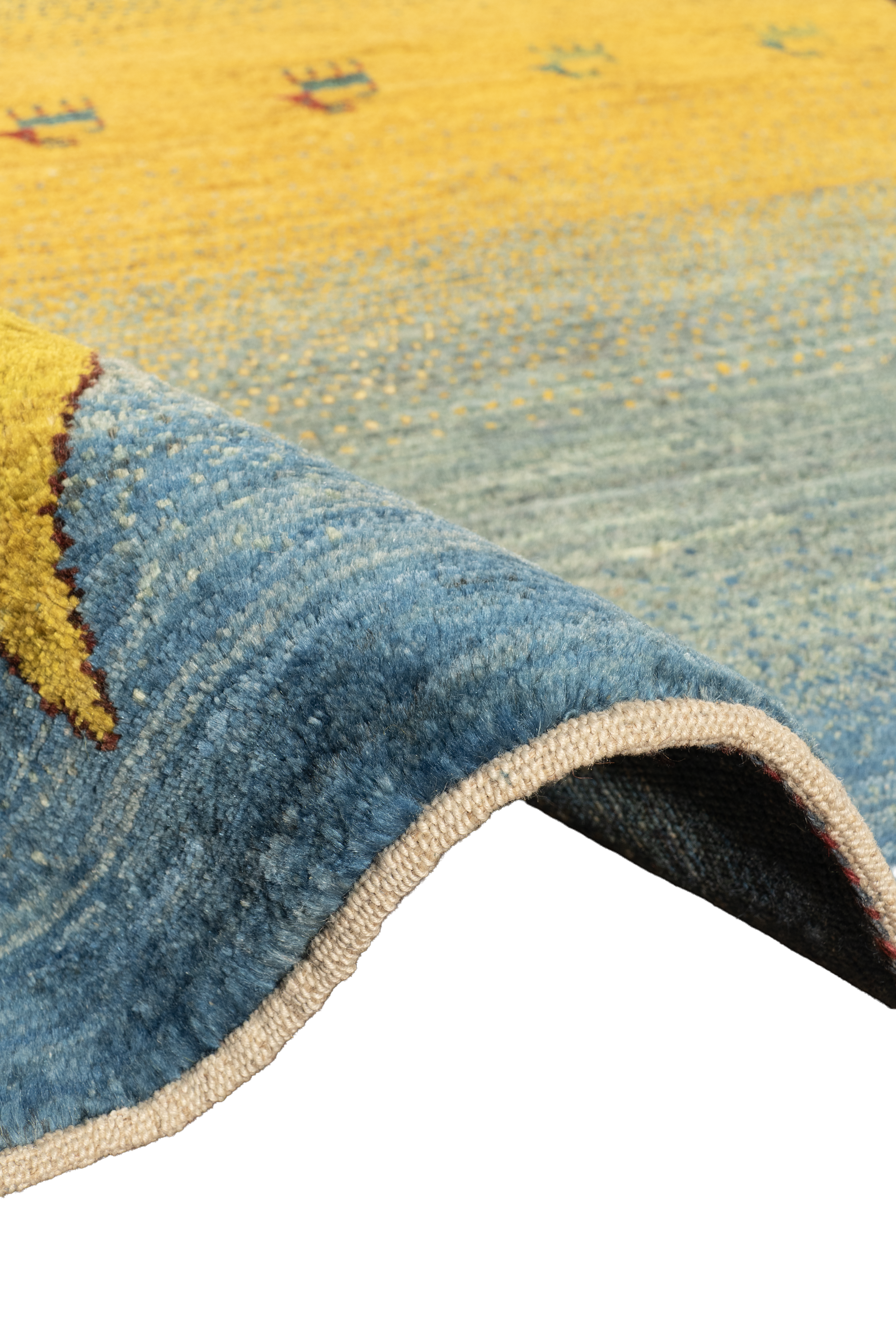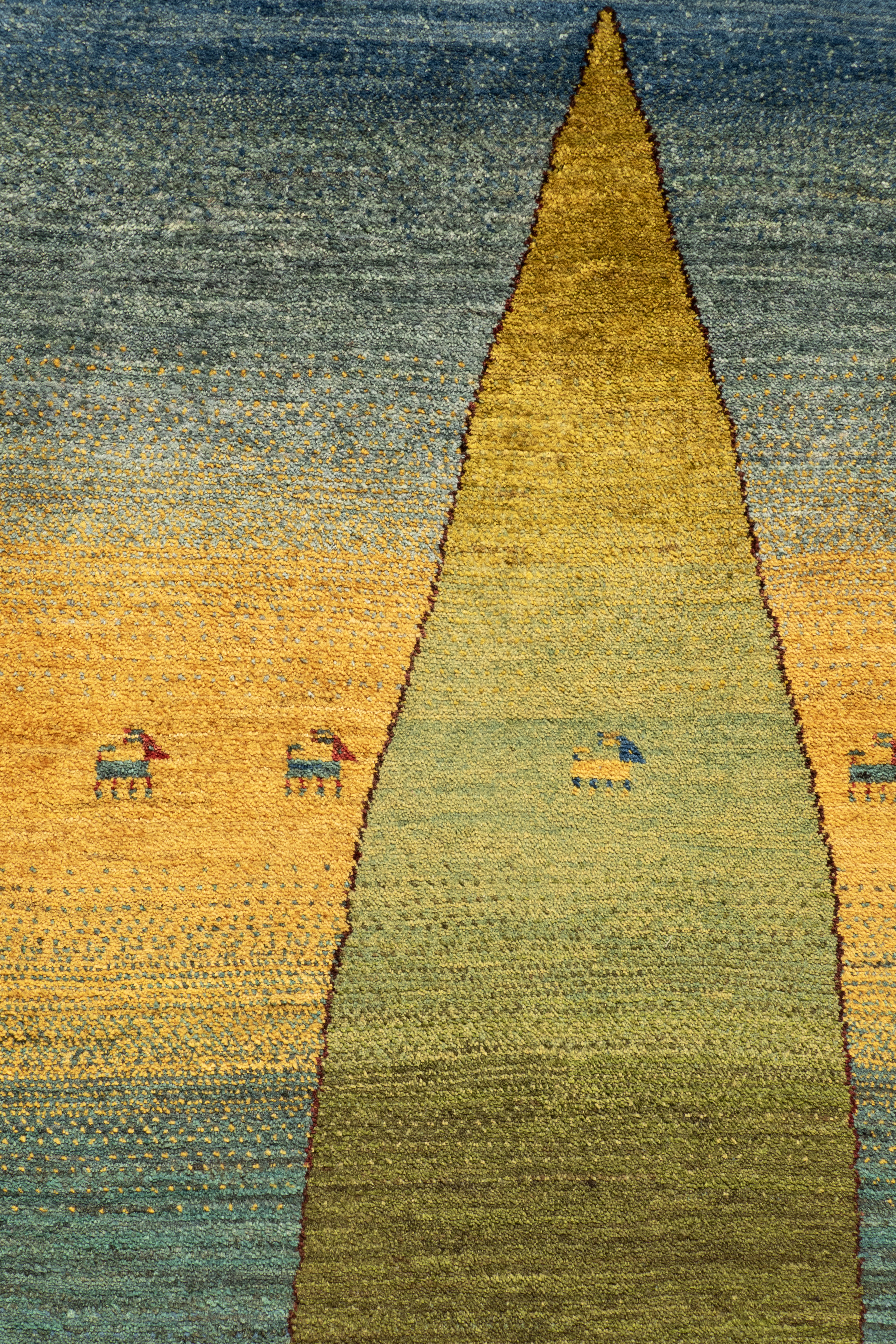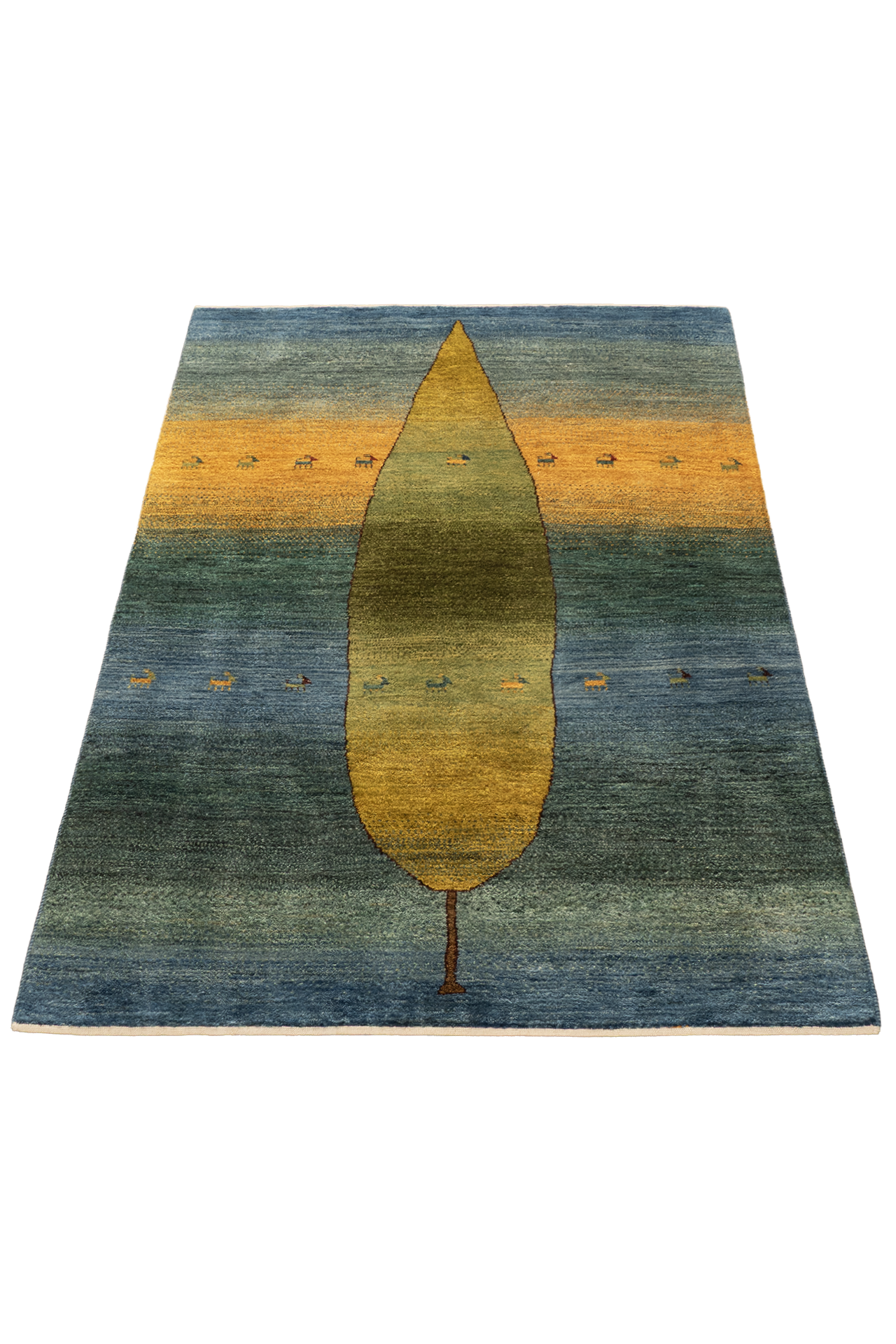 Der handgeknüpfte Gabbeh-Teppich „Sonnenbaum“ vereint traditionelle Nomadenkunst mit zeitloser Symbolkraft. Auf einem harmonischen Farbverlauf von Tiefblau über Grün bis Goldgelb erhebt sich ein stilisierter Zypressenbaum – ein zentrales Lebenssymbol der persischen Kultur. Die satt leuchtenden Naturfarben wurden aus Pflanzen und Rinden gewonnen und bringen den Teppich regelrecht zum Leuchten. Kleine Tiermotive beleben die Landschaft dezent und verleihen dem Design eine narrative Tiefe. Die klare Formensprache und der feine Glanz der handversponnenen Zagroswolle machen „Sonnenbaum“ zu einem Unikat mit meditativer Ruhe. Ein Teppich, der nicht nur den Raum wärmt, sondern auch die Seele.