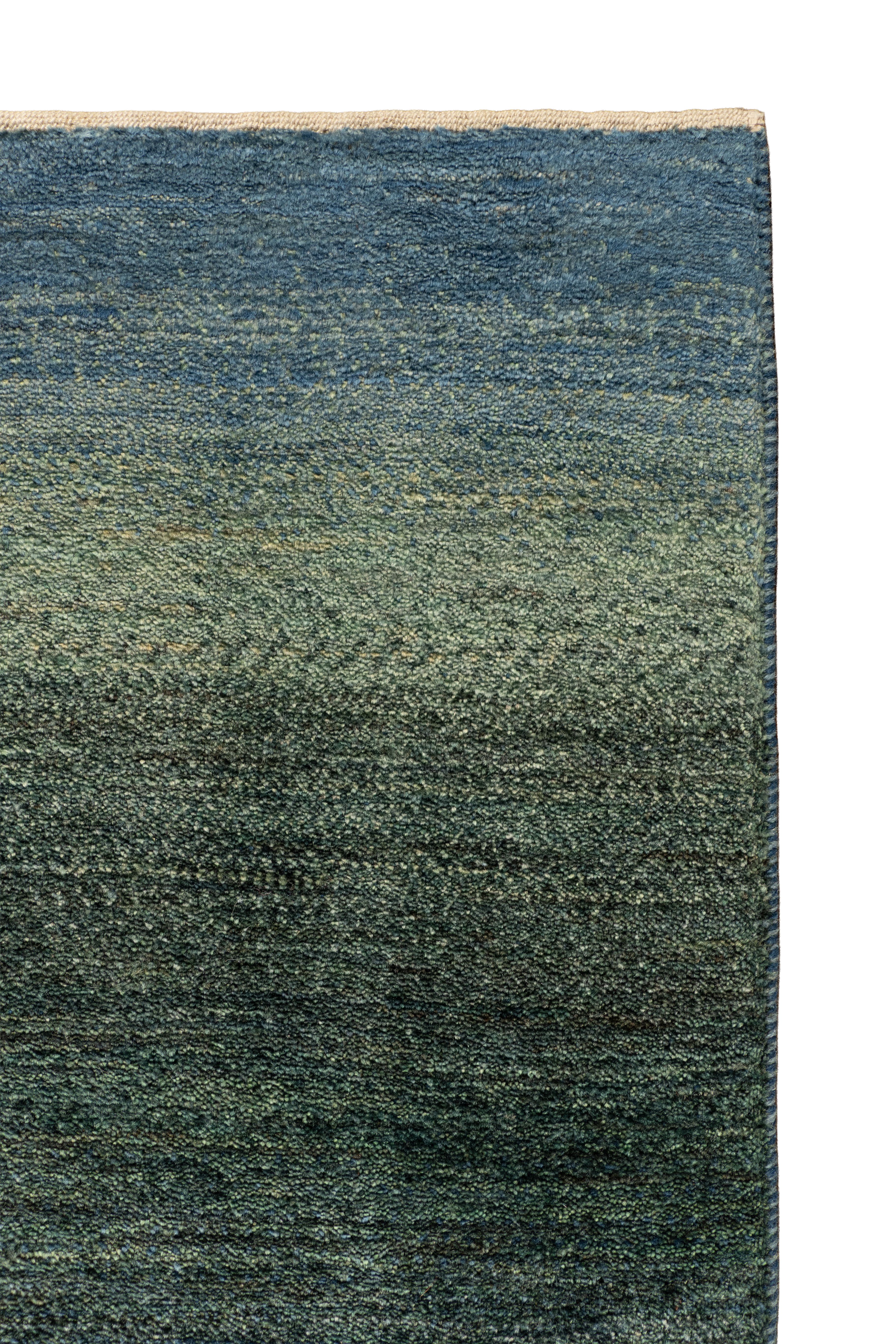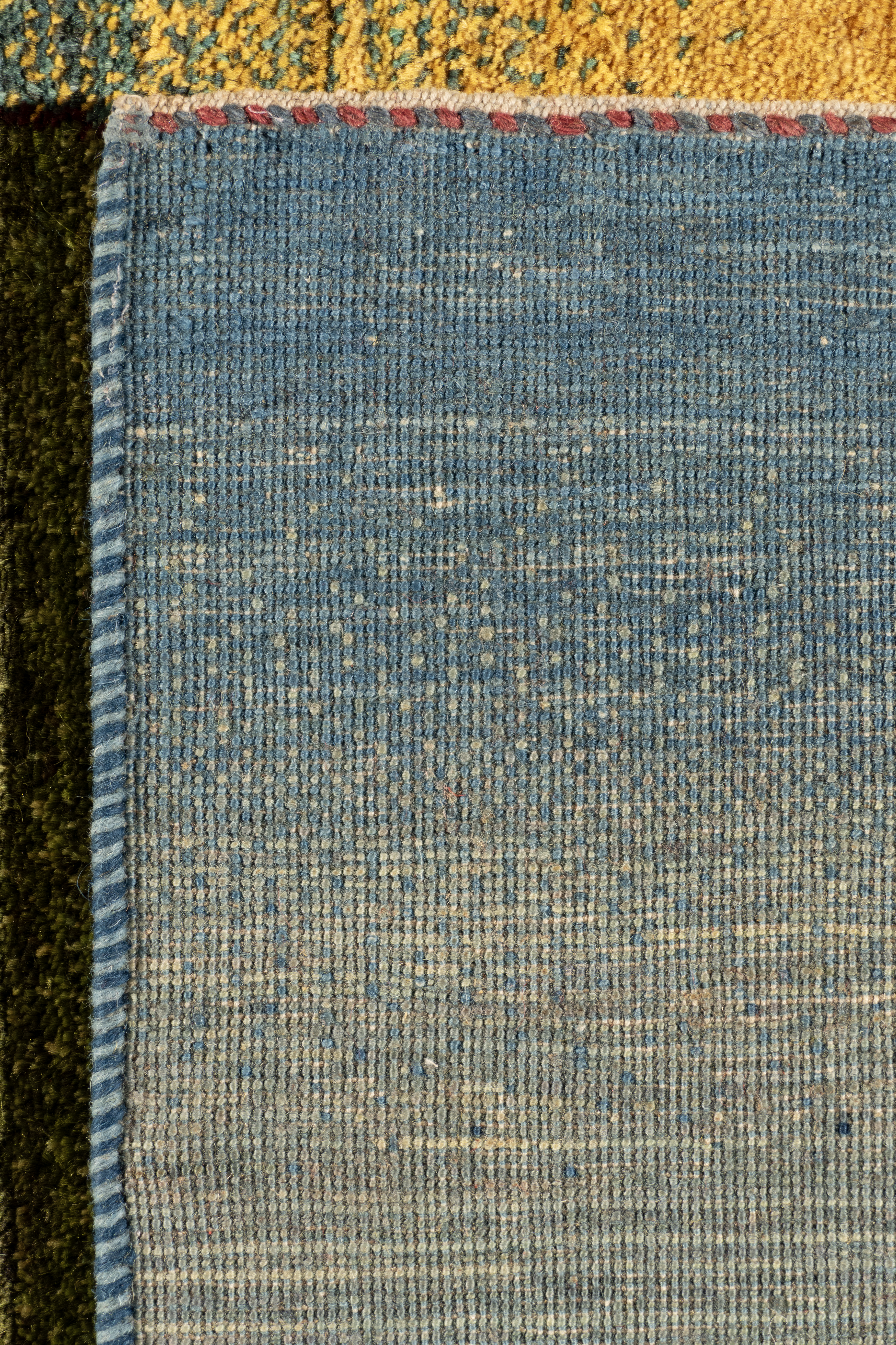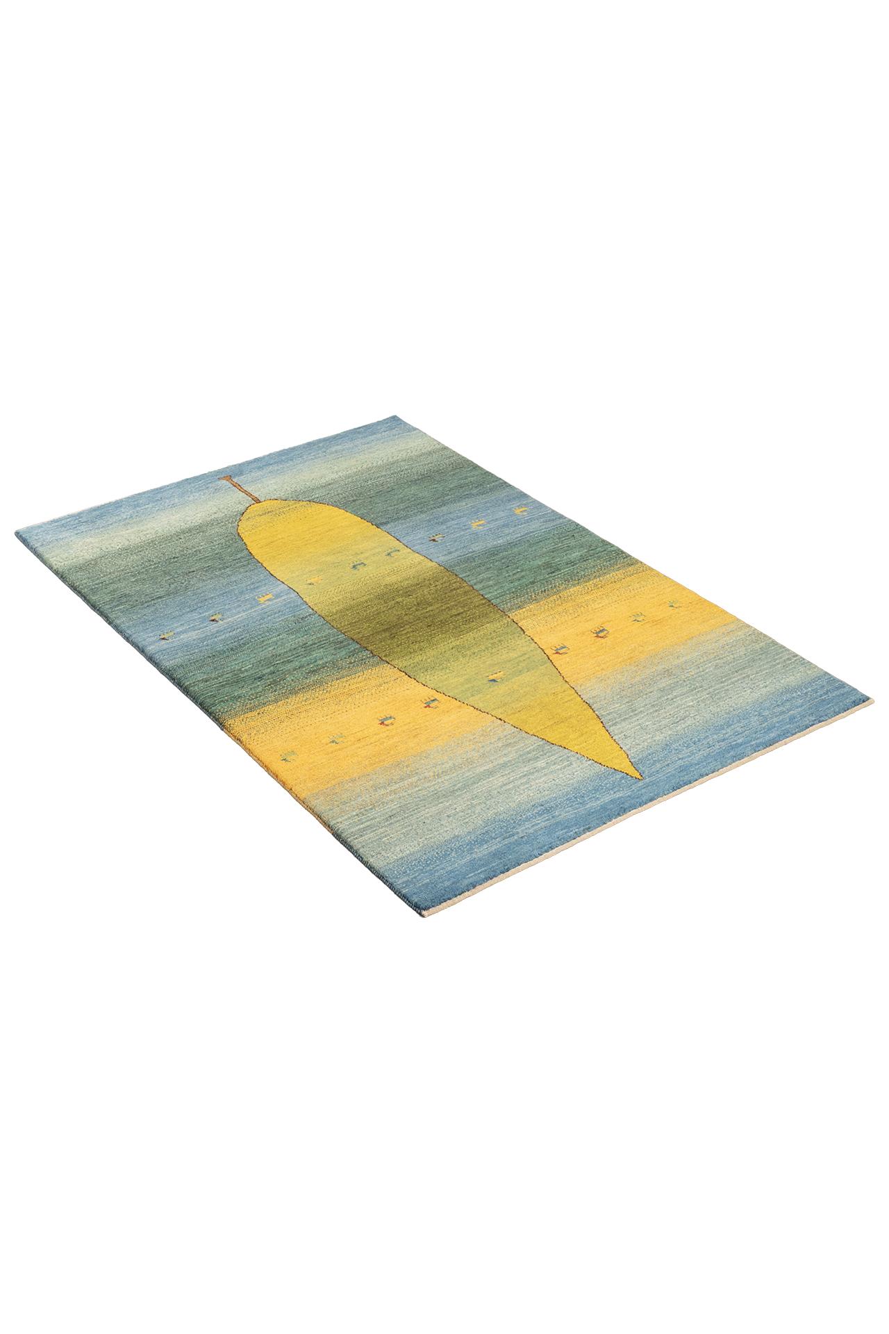 Der handgeknüpfte Gabbeh-Teppich „Sonnenbaum“ vereint traditionelle Nomadenkunst mit zeitloser Symbolkraft. Auf einem harmonischen Farbverlauf von Tiefblau über Grün bis Goldgelb erhebt sich ein stilisierter Zypressenbaum – ein zentrales Lebenssymbol der persischen Kultur. Die satt leuchtenden Naturfarben wurden aus Pflanzen und Rinden gewonnen und bringen den Teppich regelrecht zum Leuchten. Kleine Tiermotive beleben die Landschaft dezent und verleihen dem Design eine narrative Tiefe. Die klare Formensprache und der feine Glanz der handversponnenen Zagroswolle machen „Sonnenbaum“ zu einem Unikat mit meditativer Ruhe. Ein Teppich, der nicht nur den Raum wärmt, sondern auch die Seele.