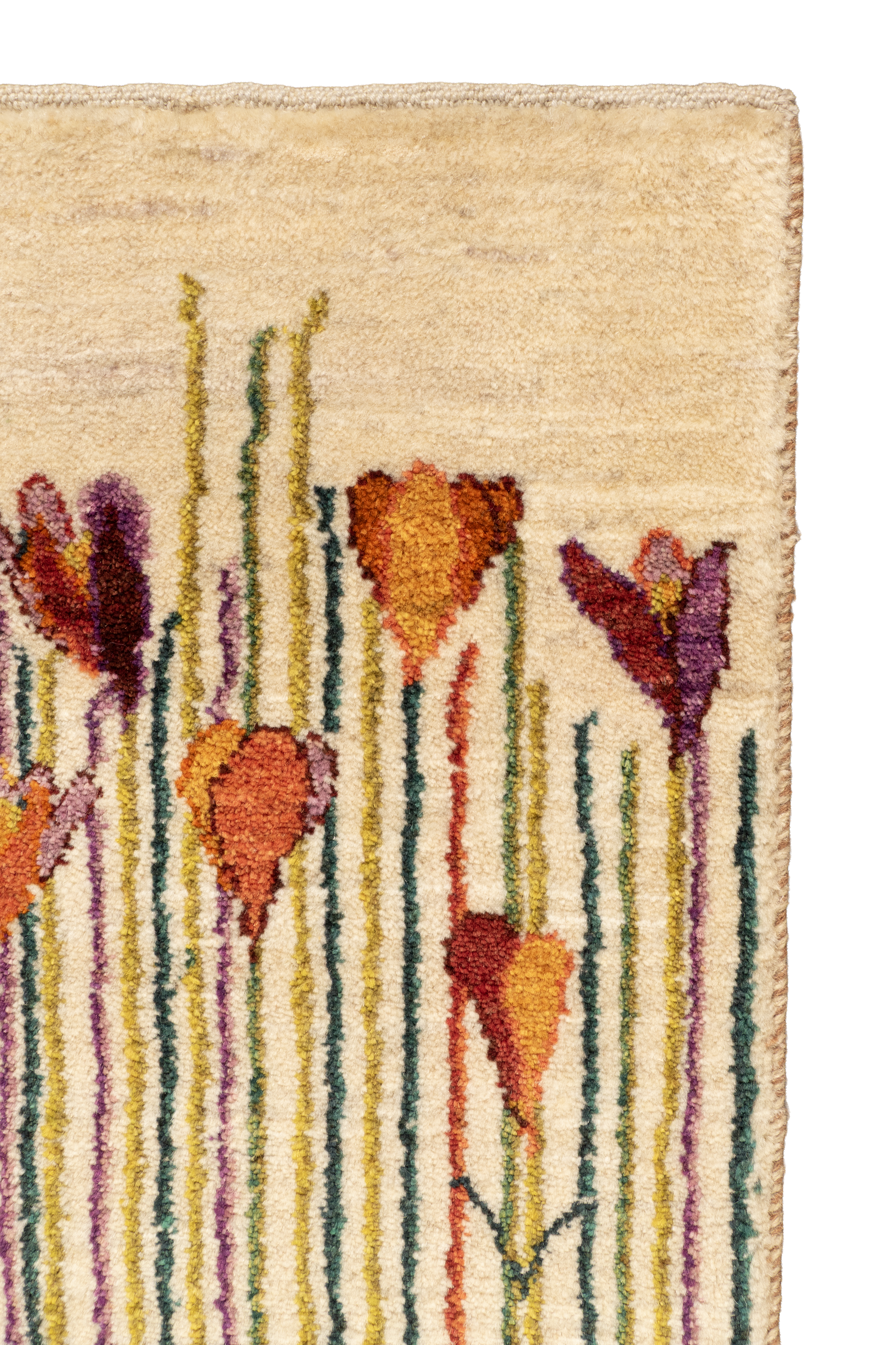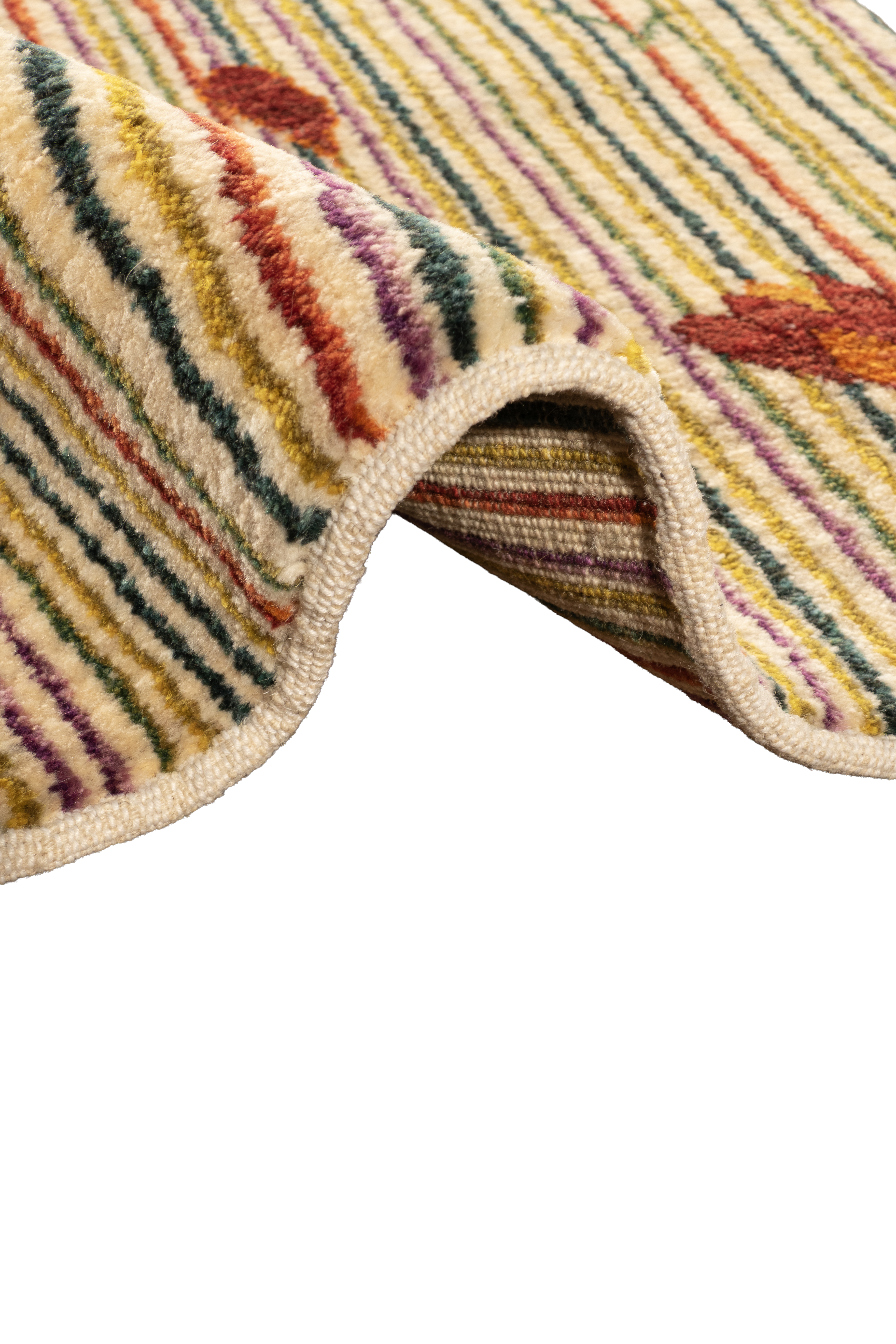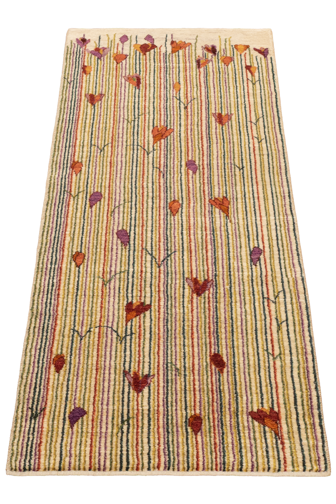 Der handgeknüpfte Gabbeh-Läufer „Blumenstreifen“ verbindet klare Struktur mit verspielter Naturmotivik. Auf einem gestreiften Fond tanzen zarte florale Formen in Orange, Rot und Violett. Die vertikalen Linien schaffen rhythmische Ruhe, während die abstrahierten Blumen Bewegung und Leichtigkeit in den Teppich bringen.