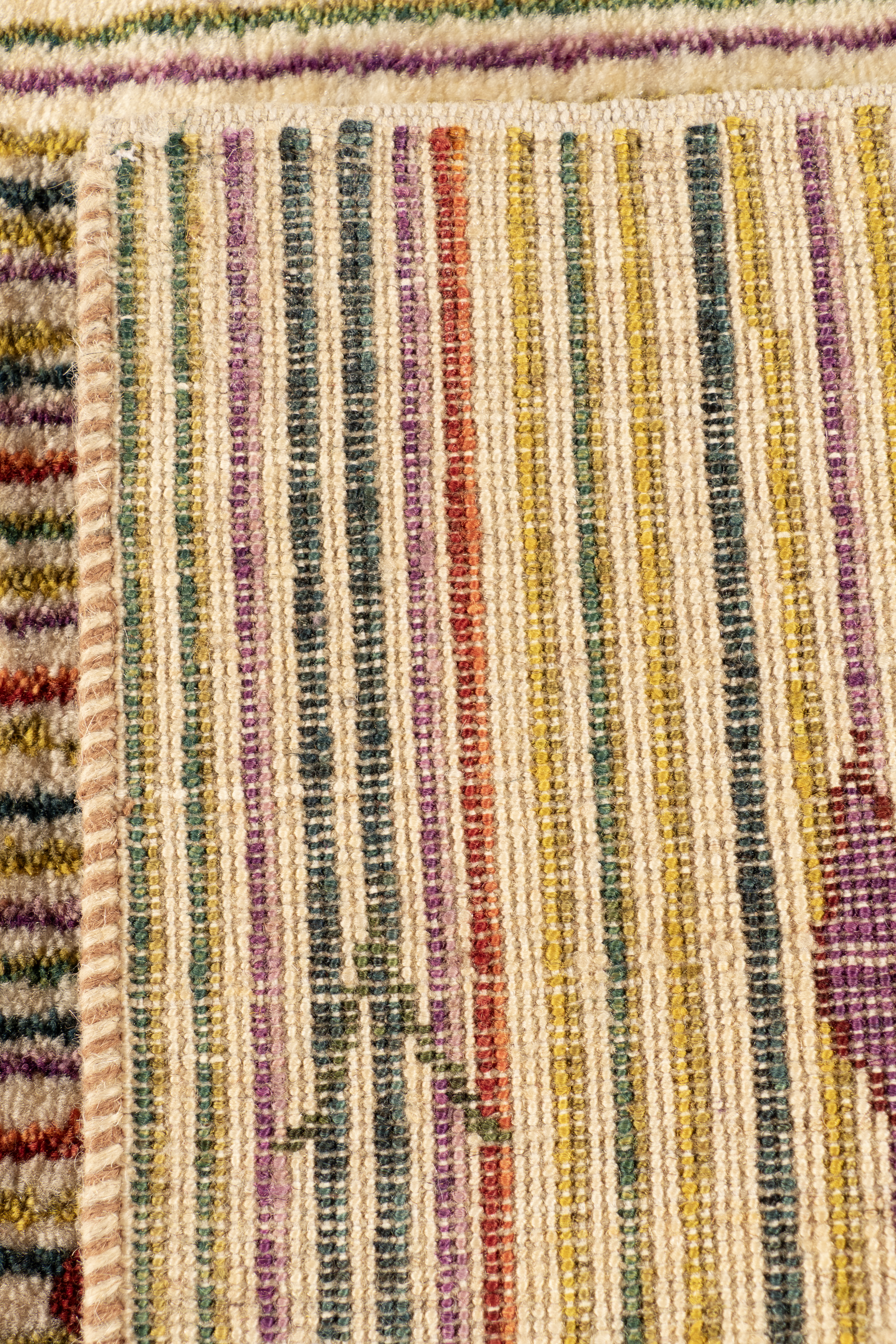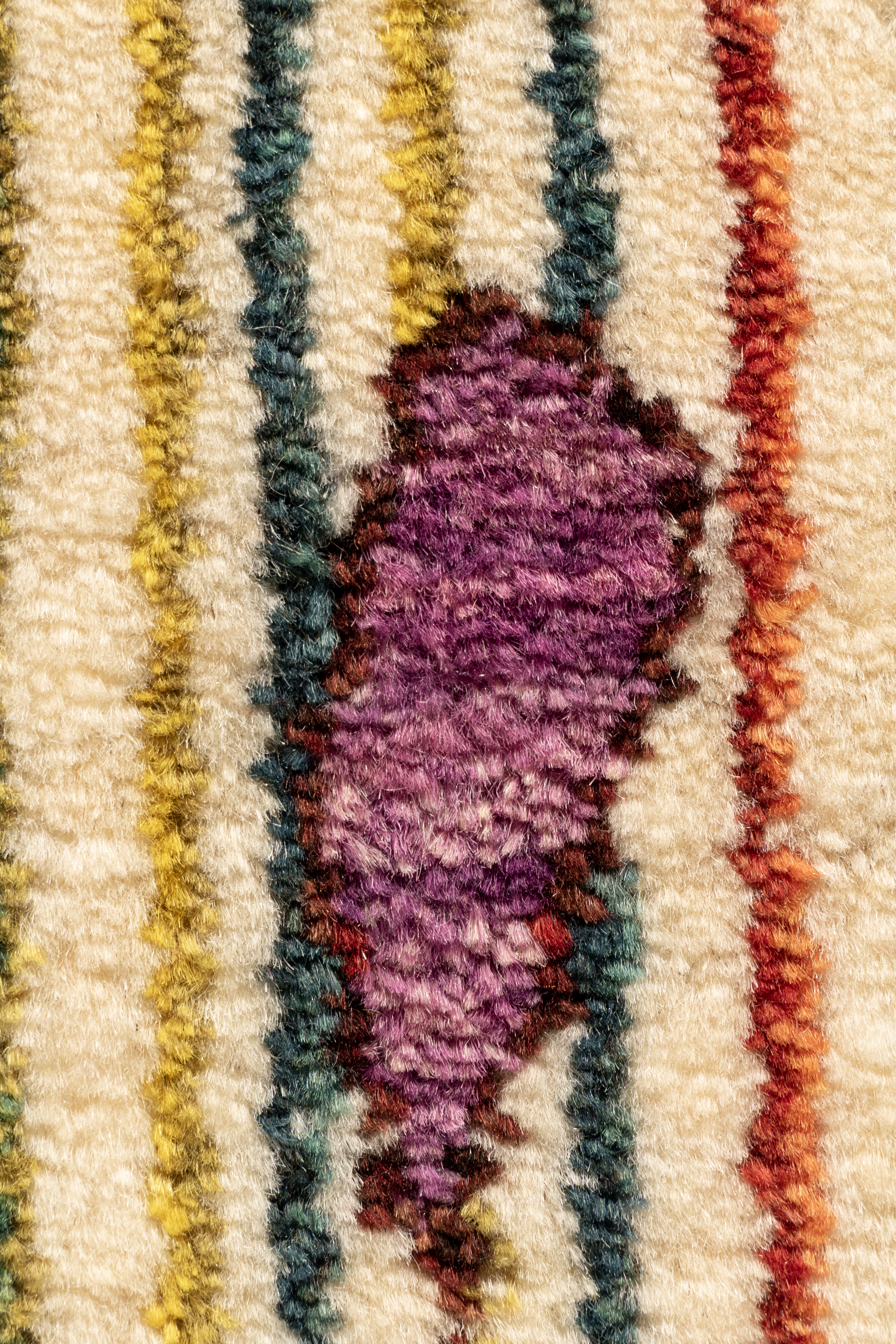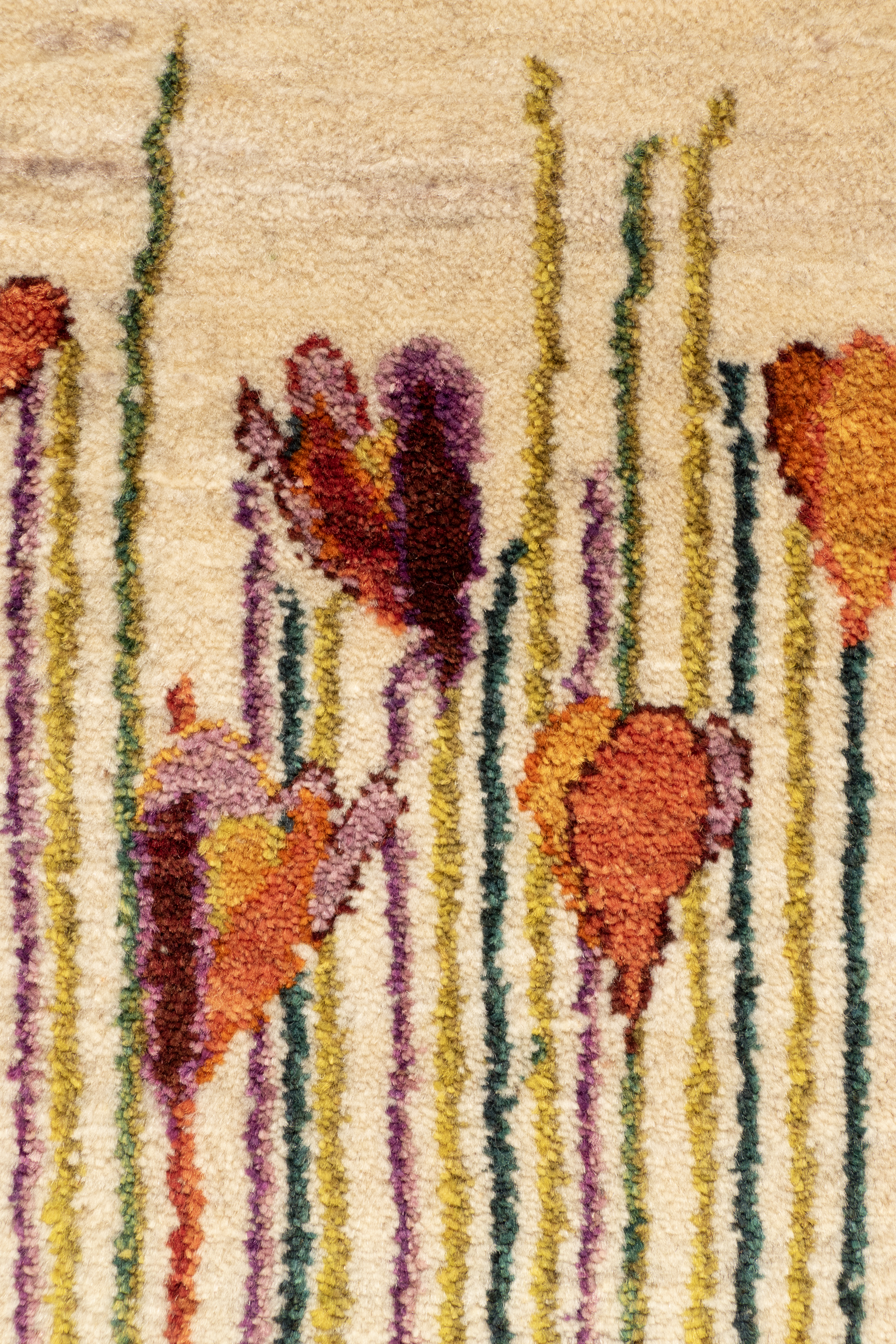 Der handgeknüpfte Gabbeh-Läufer „Blumenstreifen“ verbindet klare Struktur mit verspielter Naturmotivik. Auf einem gestreiften Fond tanzen zarte florale Formen in Orange, Rot und Violett. Die vertikalen Linien schaffen rhythmische Ruhe, während die abstrahierten Blumen Bewegung und Leichtigkeit in den Teppich bringen.