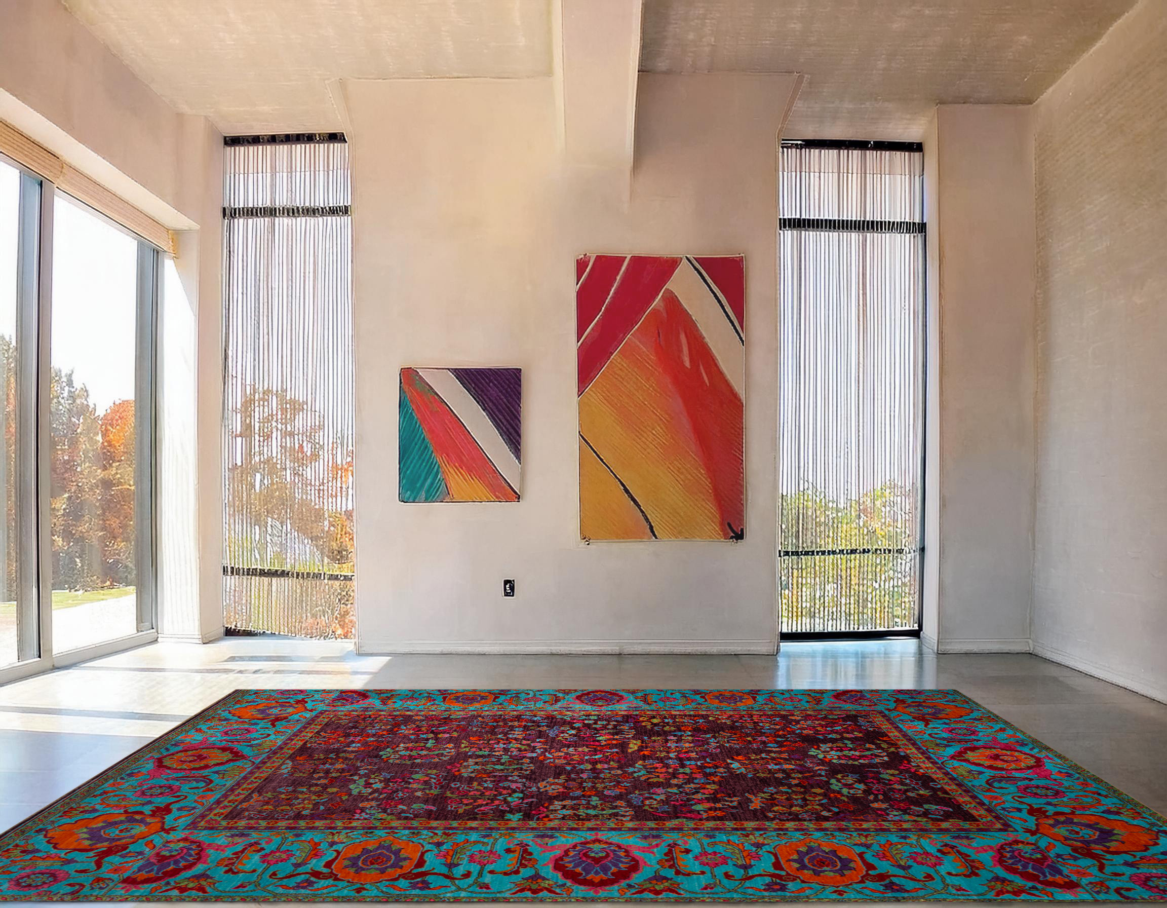 Der Rahmen bildet einen spektakulären Kontrast: ein leuchtendes Türkis, verziert mit üppigen Ornamenten, stilisierten Blüten und dekorativen Formen in kräftigem Orange, Pink und Violett. Dieser starke Gegensatz aus kühlem Blaugrün und warmen, opulenten Farben macht den Teppich zu einem visuellen Highlight. Die klaren Muster treffen hier auf den typischen „Pulse“-Effekt, der dem Design eine moderne, leicht verwaschene Dynamik verleiht.