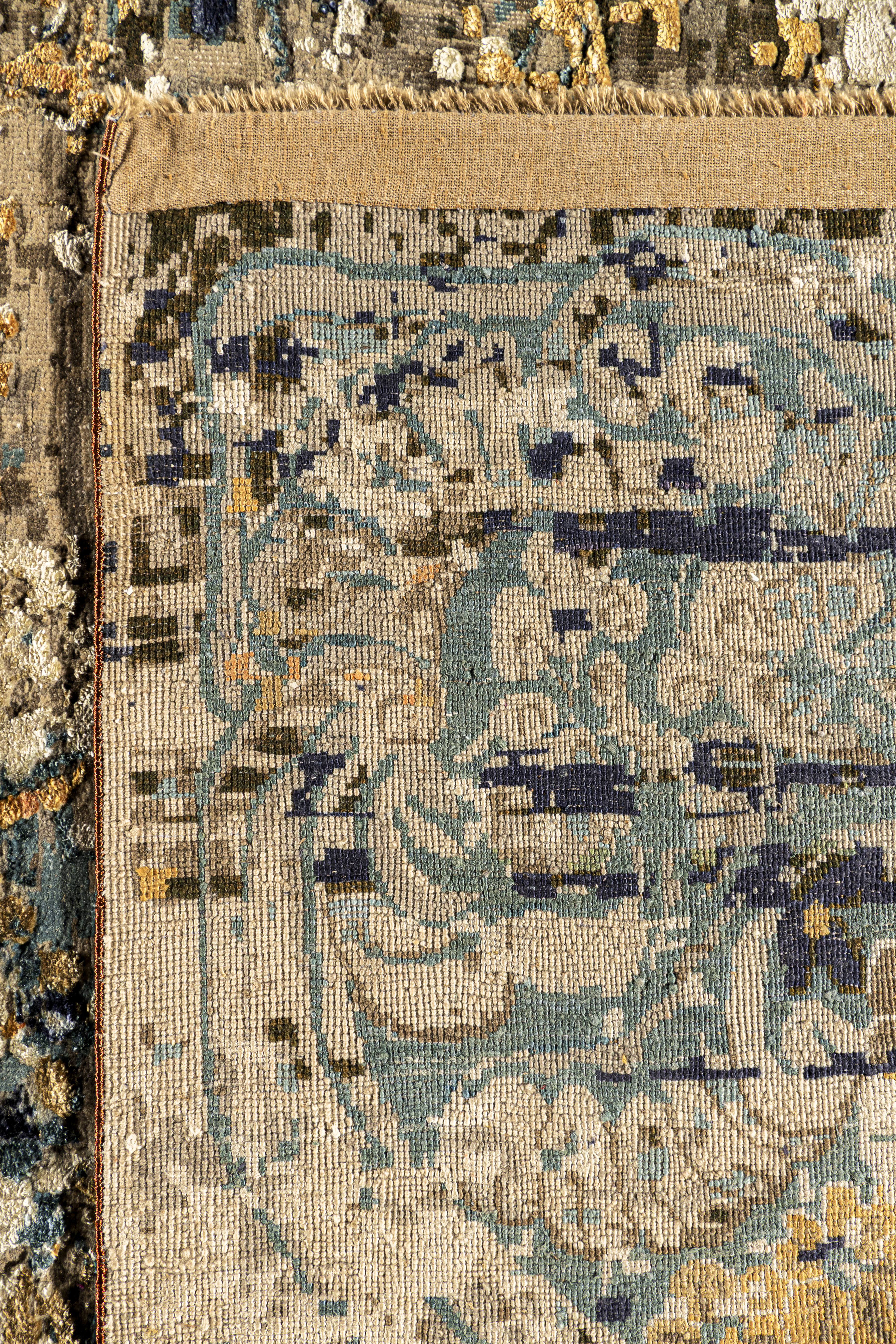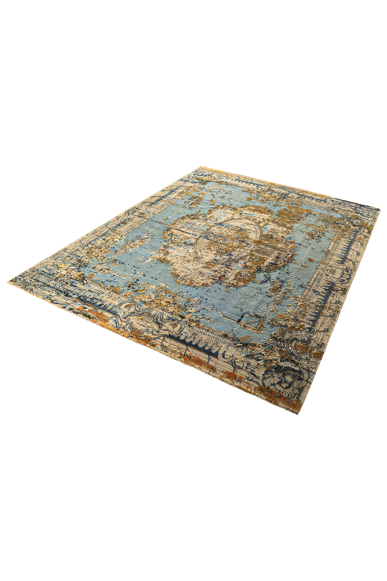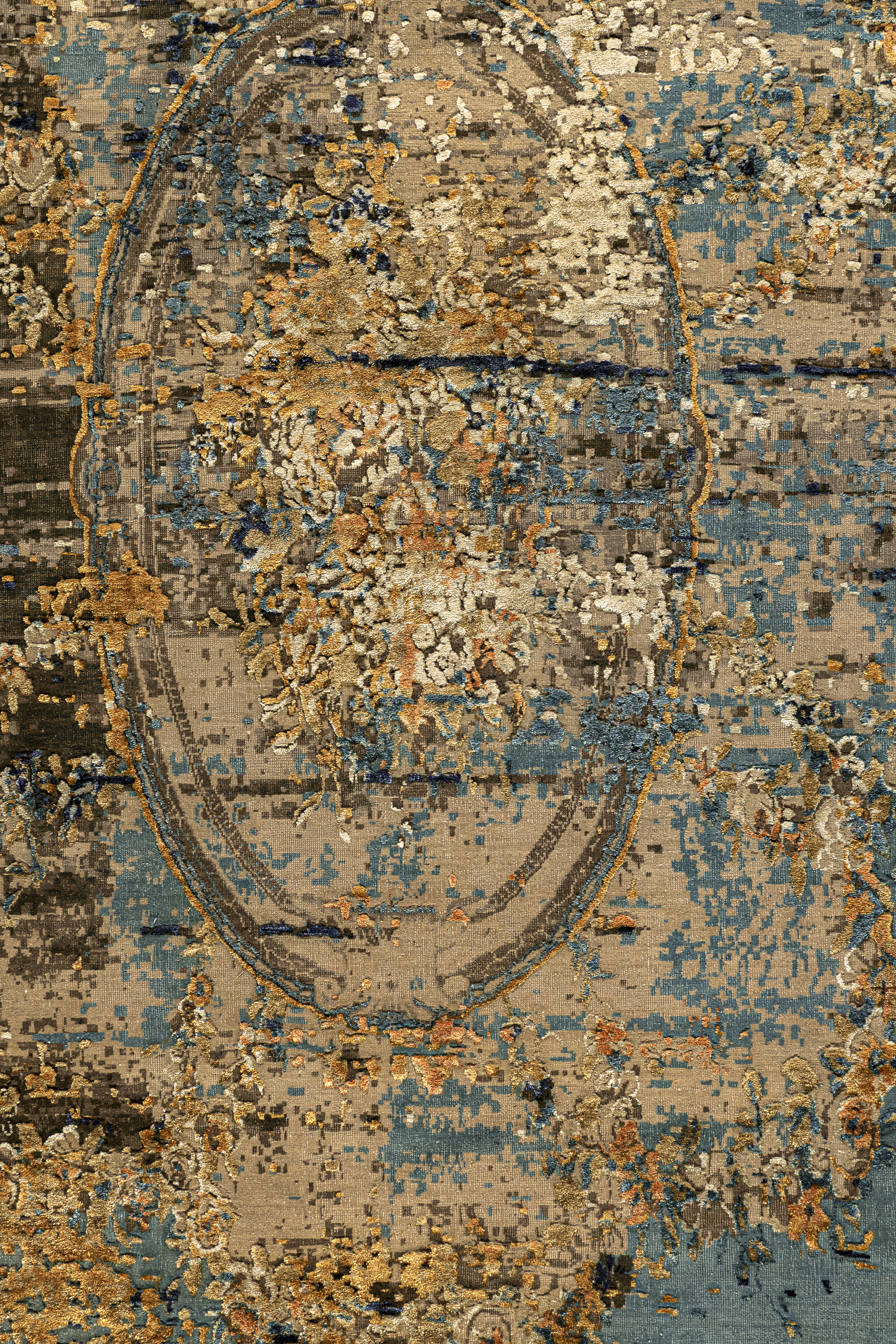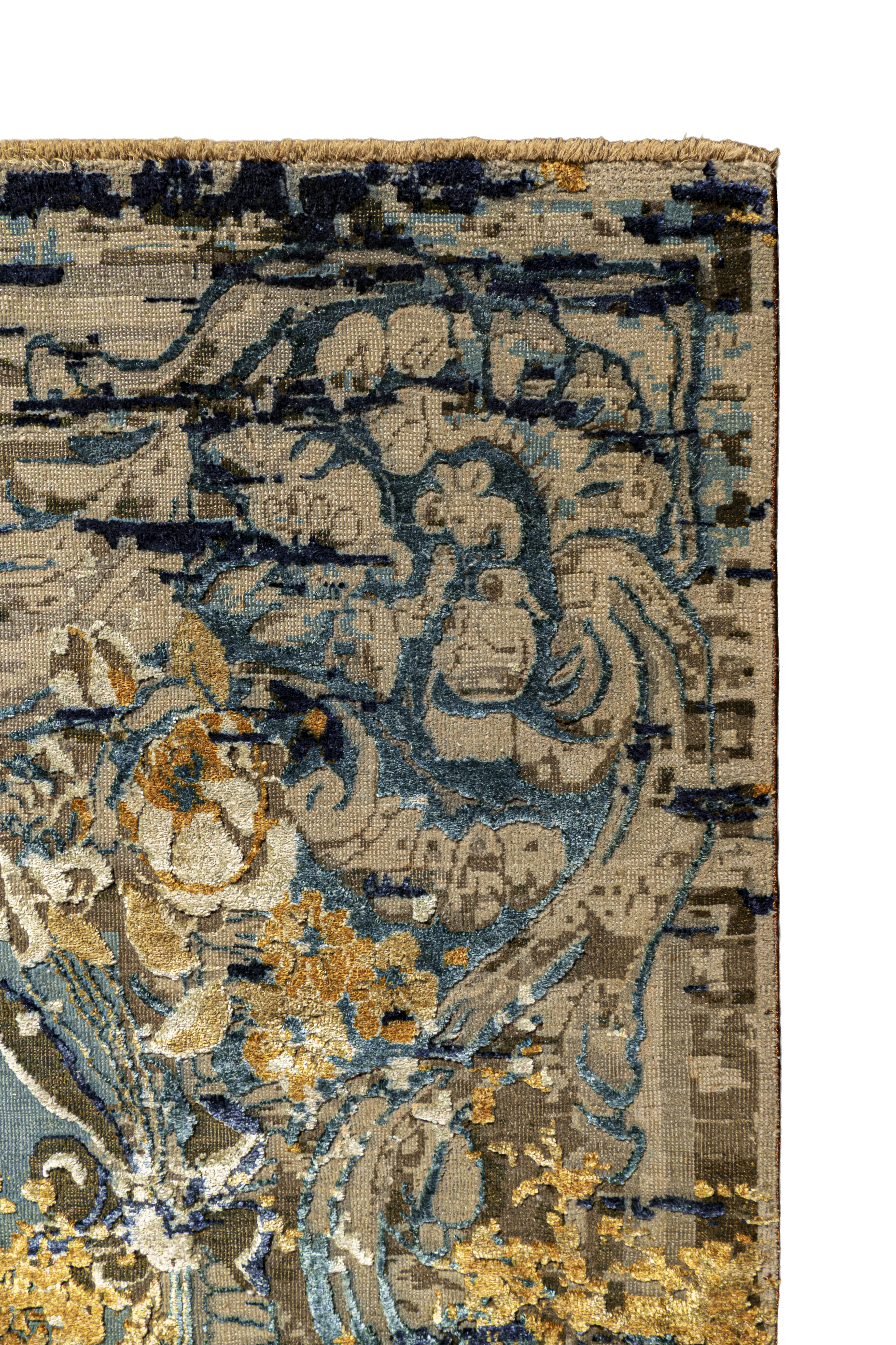 Die kraftvollen Blautöne treffen auf warme Orangeakzente, die durch fein eingearbeitete Seidenfasern zum Leben erweckt werden. Je nach Lichteinfall verändert sich der Glanz der Oberfläche und verleiht dem Teppich eine dynamische, elegante Wirkung.