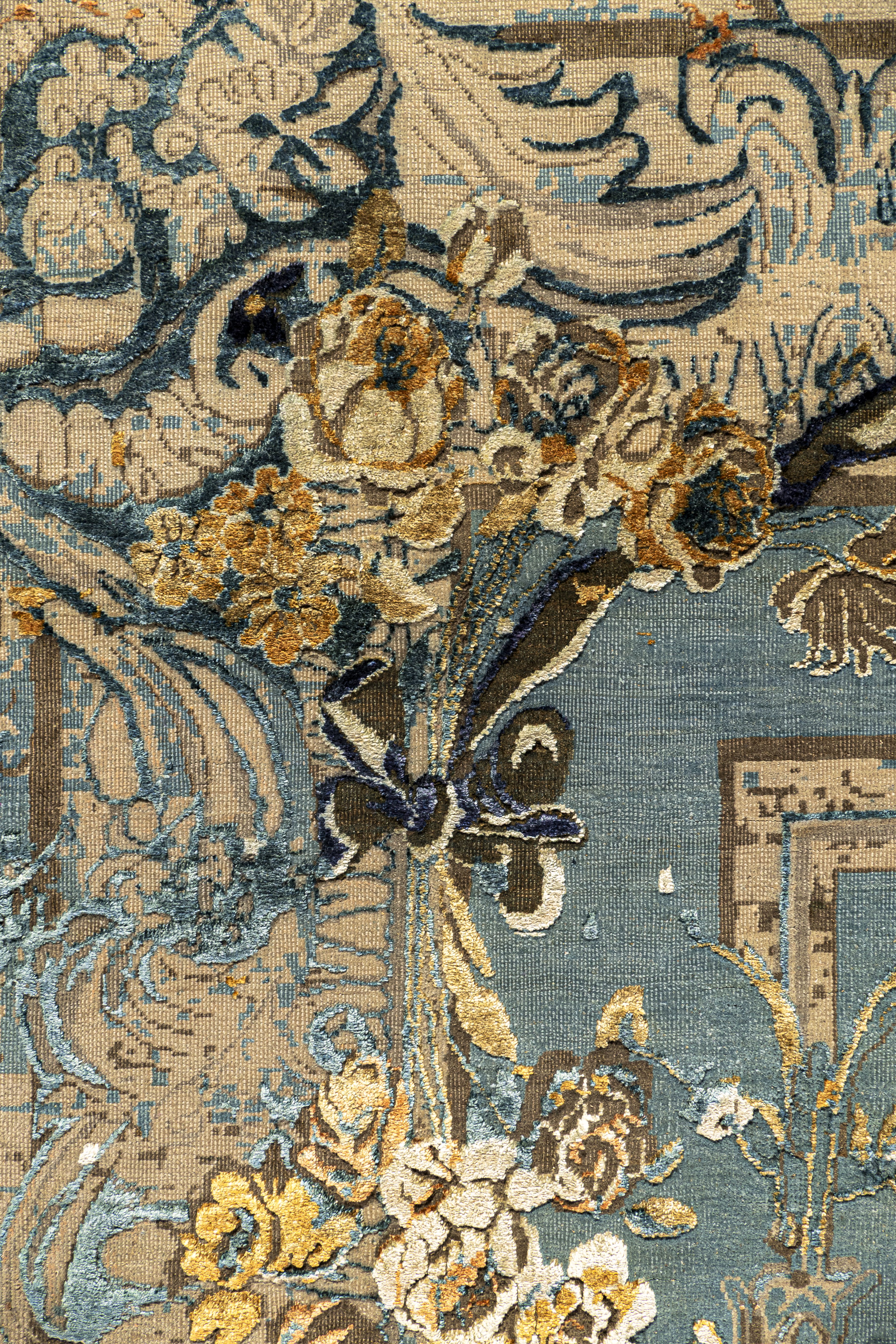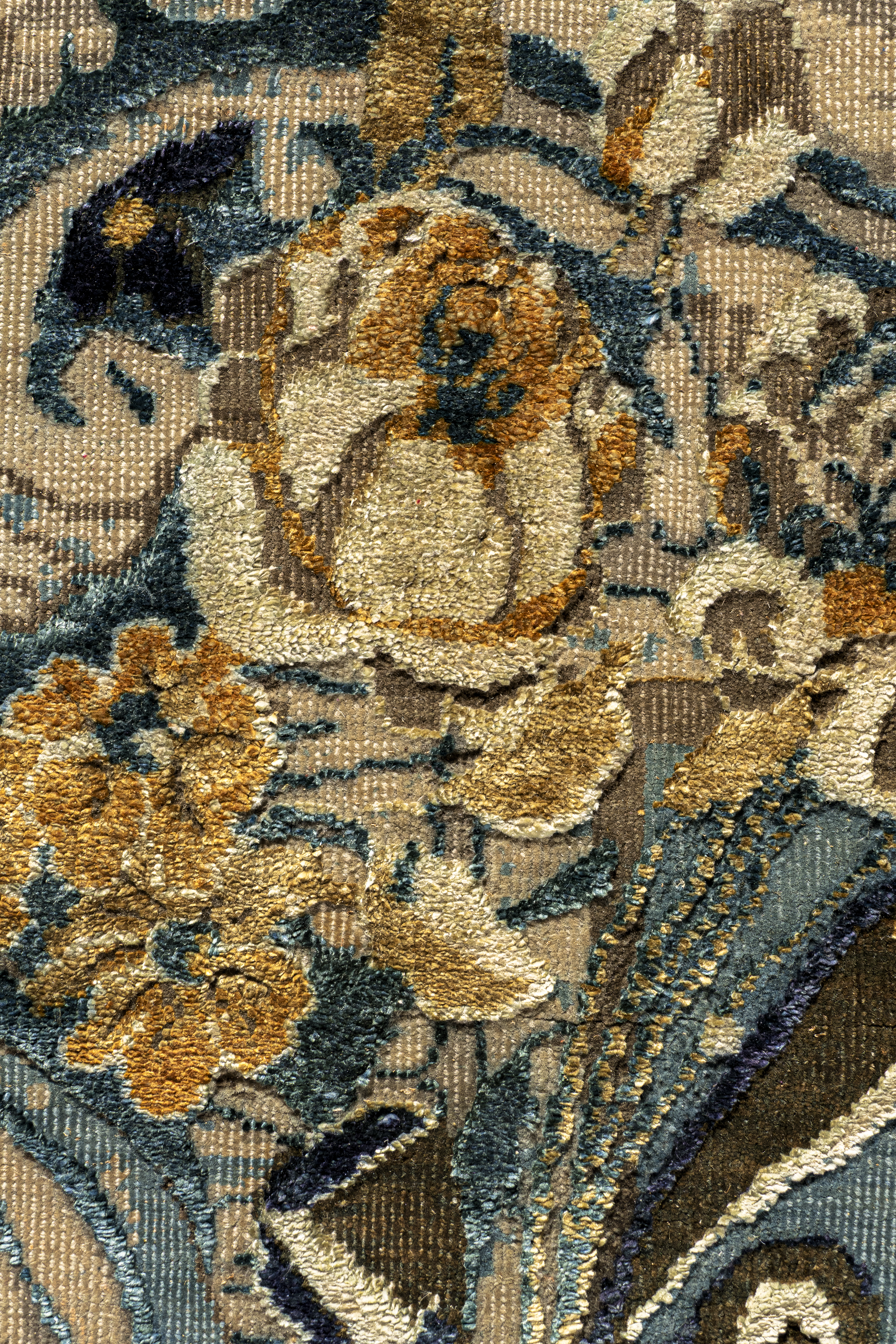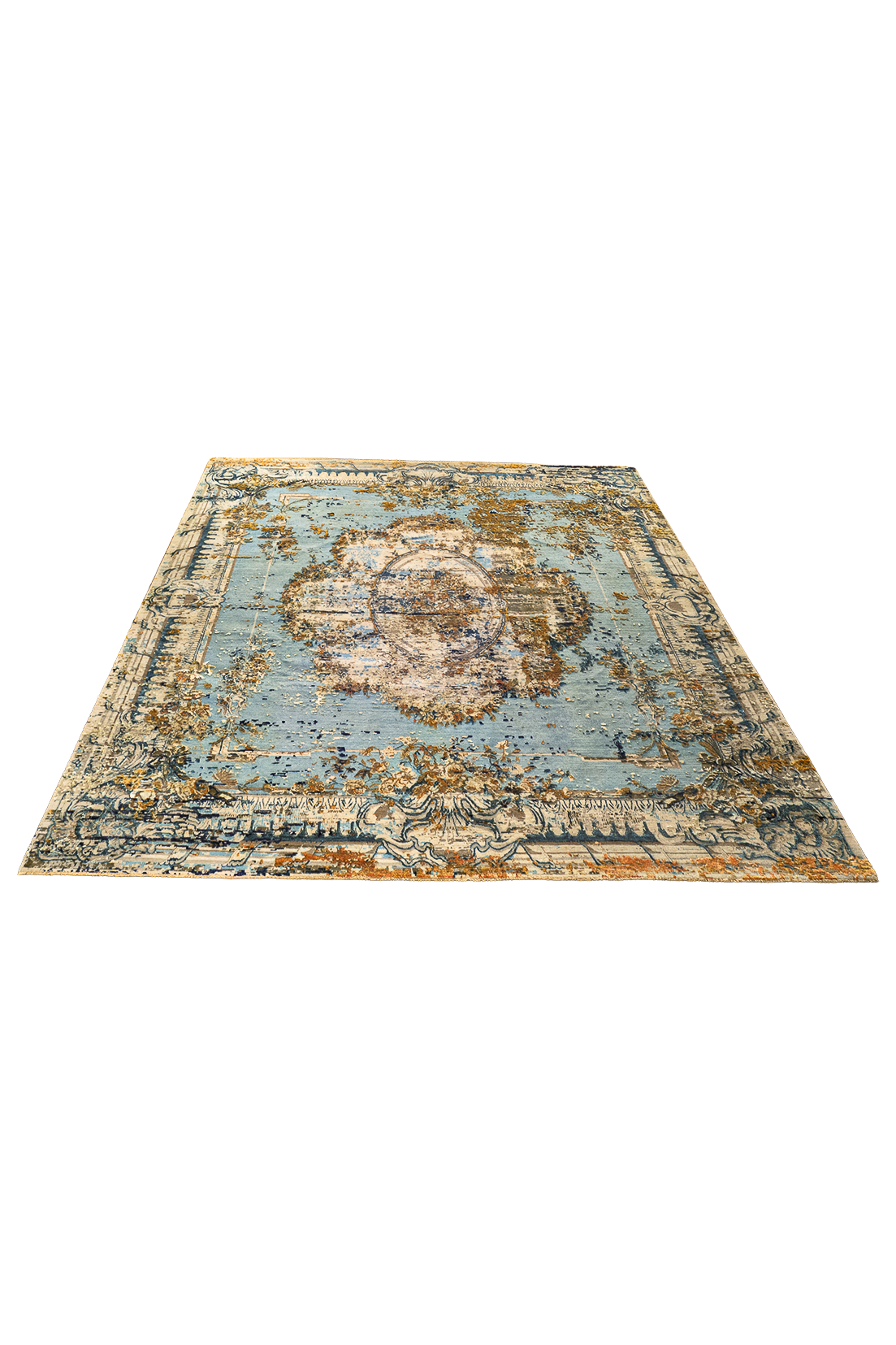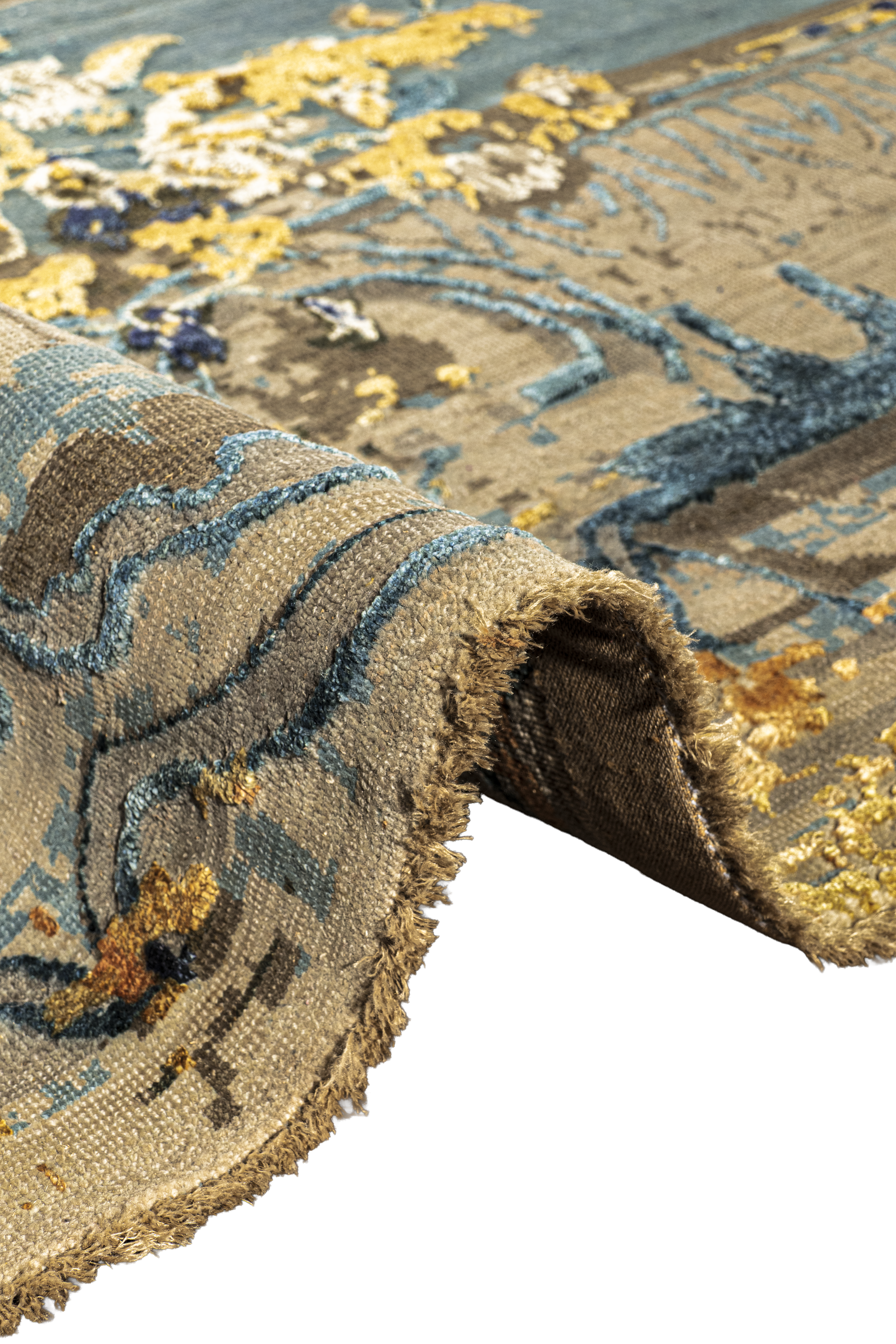 Die kraftvollen Blautöne treffen auf warme Orangeakzente, die durch fein eingearbeitete Seidenfasern zum Leben erweckt werden. Je nach Lichteinfall verändert sich der Glanz der Oberfläche und verleiht dem Teppich eine dynamische, elegante Wirkung.