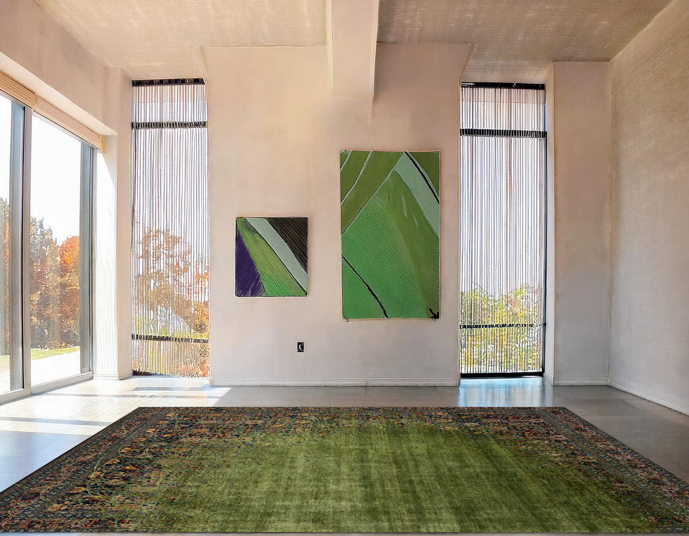 Der moderne Bruch entsteht durch den charakteristischen „Buzz“-Effekt: Eine dynamische Welle aus intensiven Grüntönen flutet die gesamte rechte Teppichhälfte und lässt das traditionelle Muster dort nahezu verschwinden. Die Übergänge wirken wie vibrierende, organische Bewegungen – mal dichter, mal transparenter – und erzeugen einen spannenden Kontrast zwischen klassischer Ornamentik und zeitgenössischer Farbfläche.