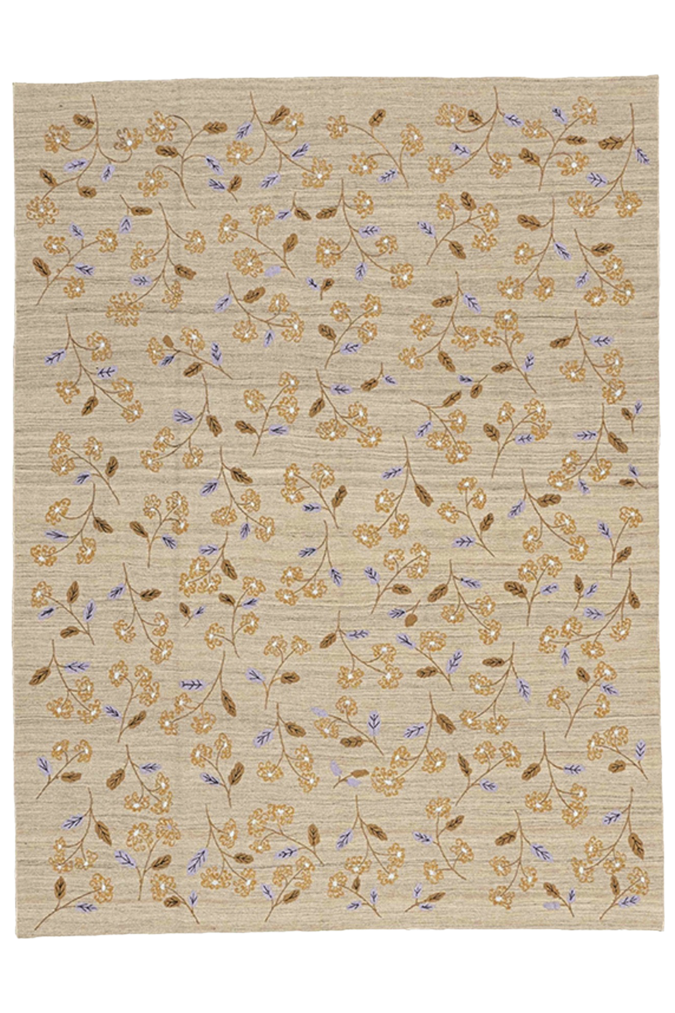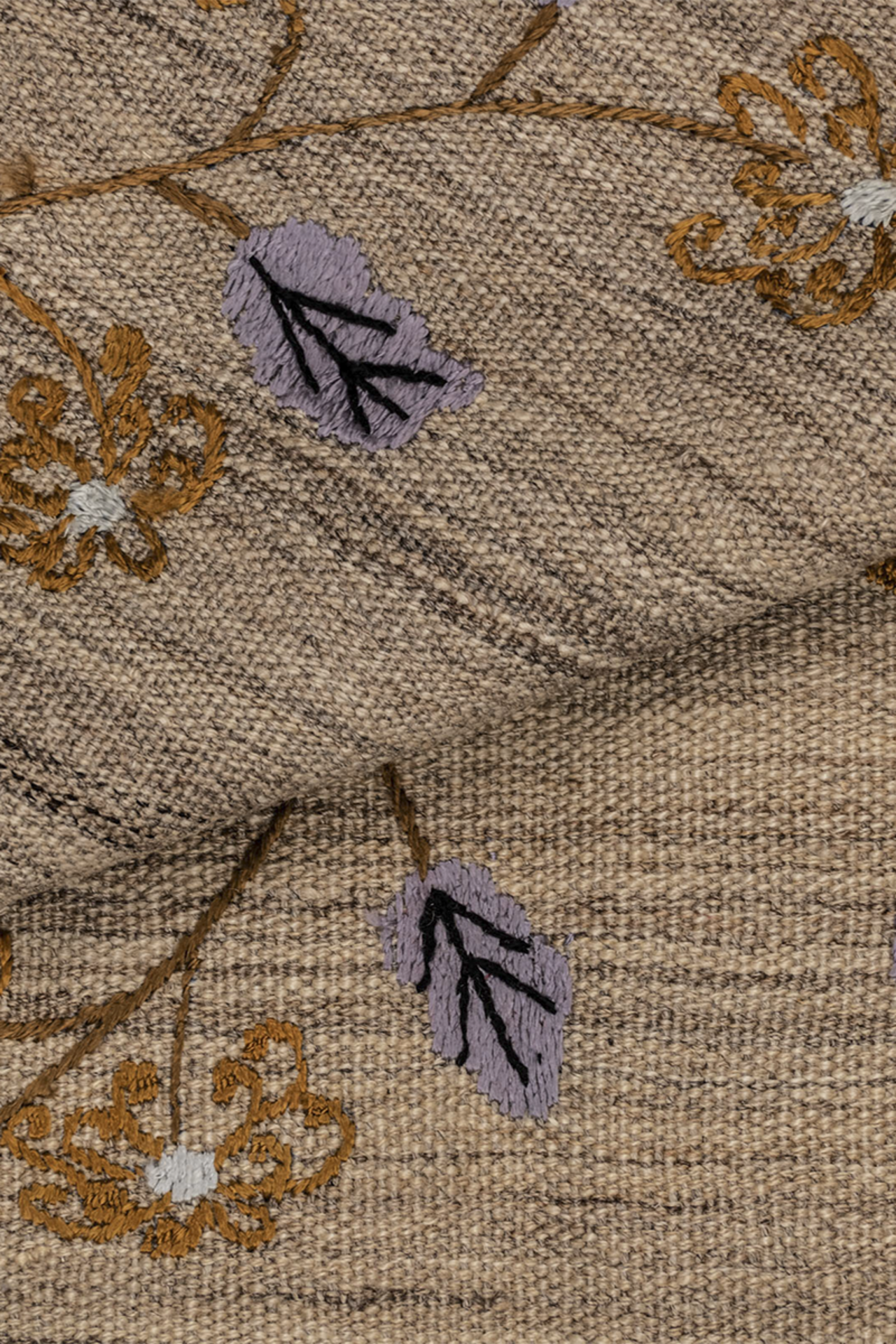 Dieser bezaubernde, flachgewebte Kelim Teppich ist aus bester Zagroswolle Im Iran von Hand gewoben worden. Die feinen lilafarbenen Blumen und Blätter sind aus reiner Naturseide und Naturfarben in den Teppich gestickt. Der dezente Hintergrund aus beigefarbener Wolle verleiht dem Teppich eine elegante Basis und lässt der Bestickung ihren Wirkungsraum. Der Teppich passt sehr gut in Wohneinrichtungen mit viel Holz oder alternativ in sehr moderne Wohnräume. Ebenfalls beliebt sind die flachen Teppiche für den etwas ausgefalleneren Bohemien Wohnstil. Für diesen schönen Teppich empfehlen wir eine Antirutsch-Unterlage. Bedenkenlos kann der Teppich auch auf Böden mit Fußbodenheizung gelegt werden.