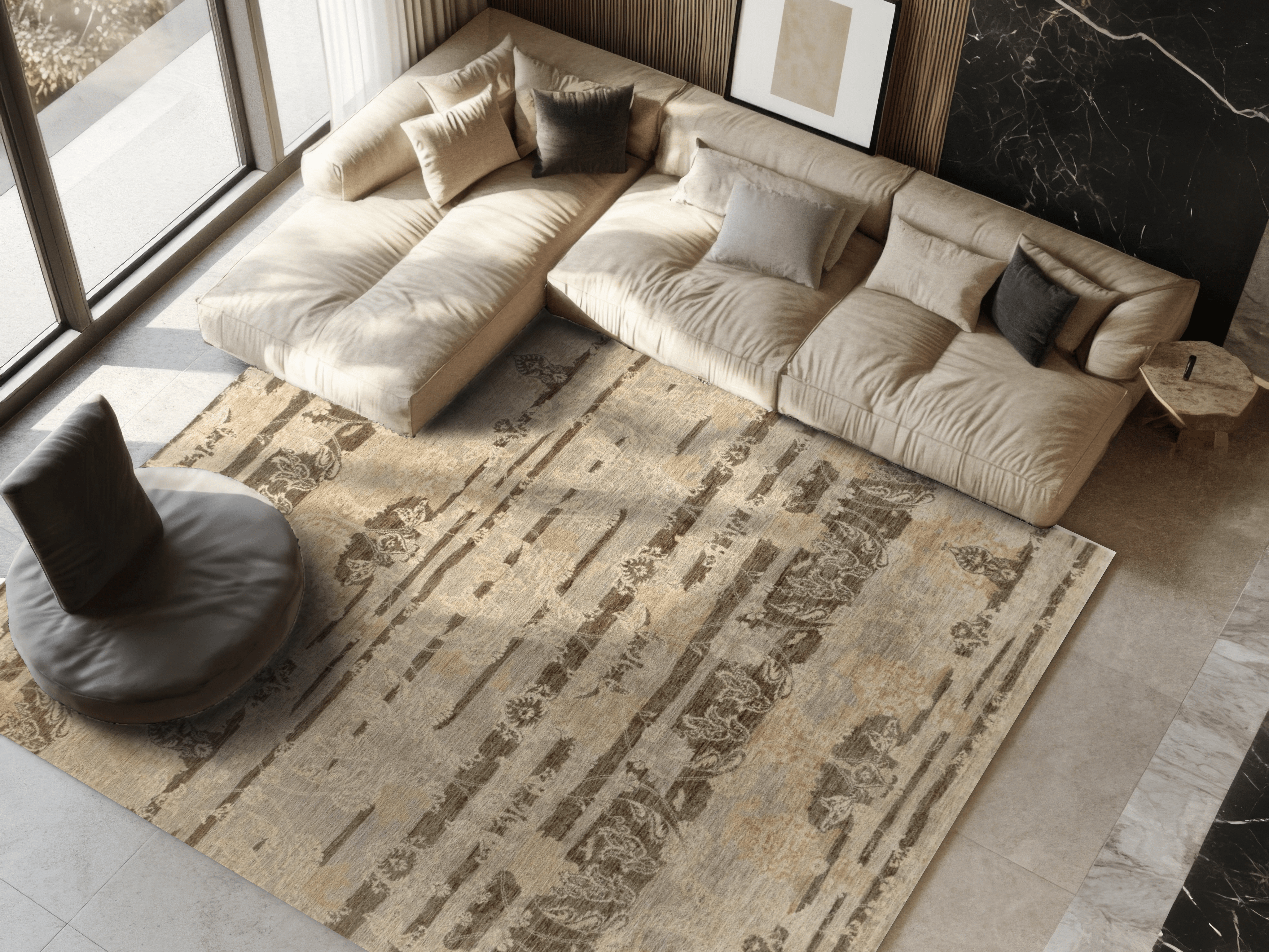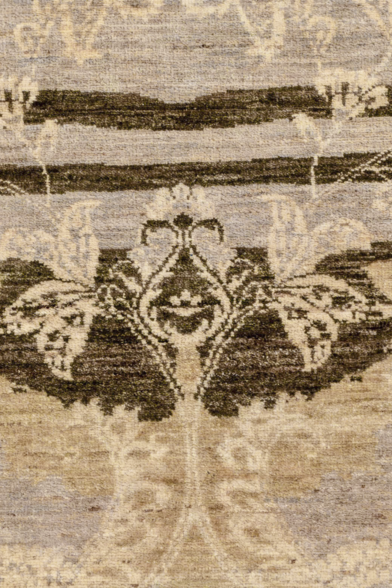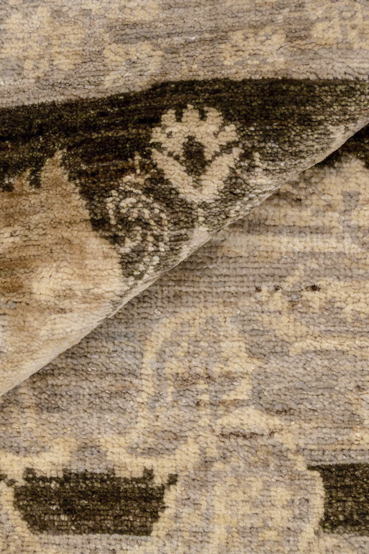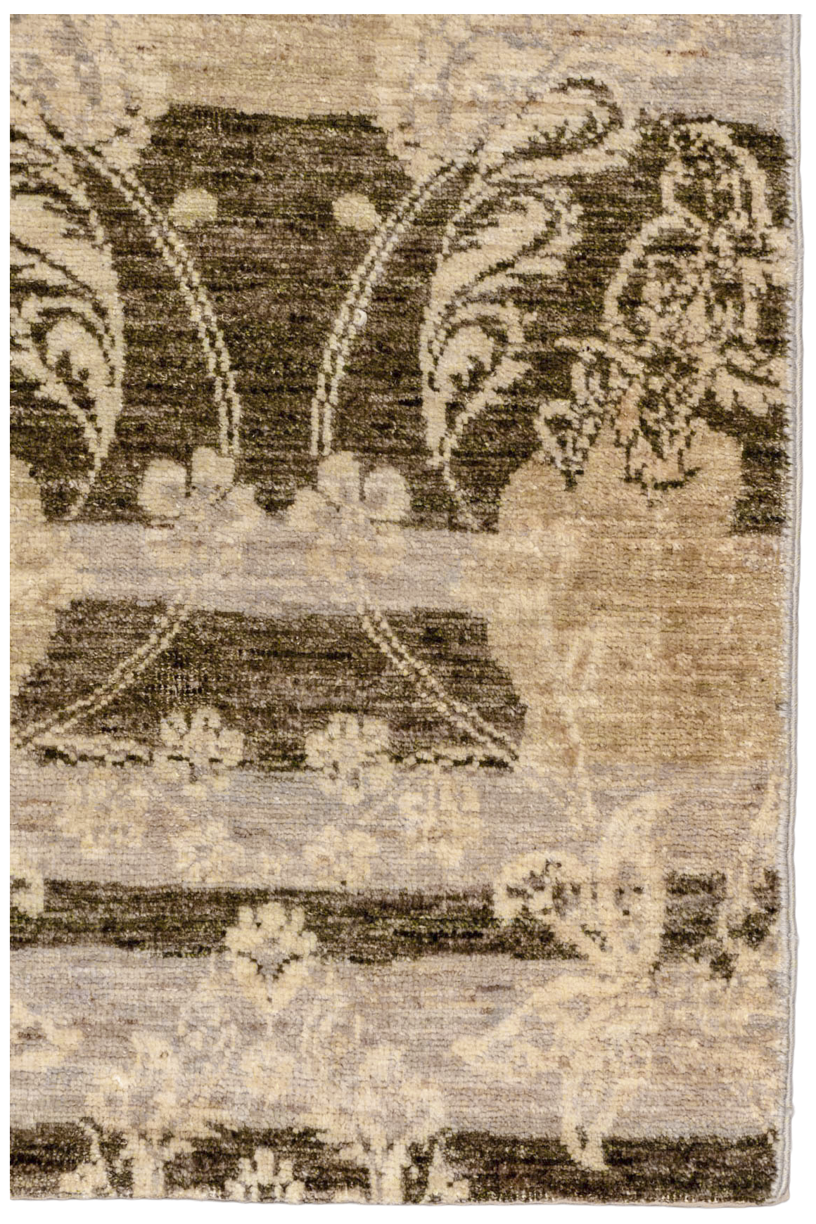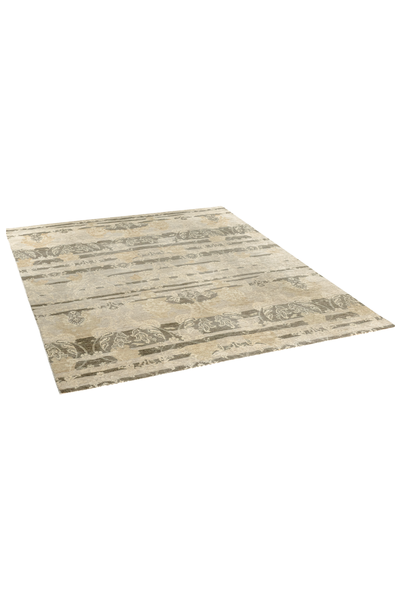 Dieser schöne Design-Teppich aus der Jordan Collection ist ein handgeknüpfter Teppich mit warmen Erd-und Grüntönen. Das Muster ist abstrakt und aufgelöst, weshalb sich der Teppich harmonisch in ein Interieur Konzept einfügen lässt. Der Teppich besteht aus Karakul-Wolle und ist Dank der hochwertigen Wolle äußerst strapazierfähig und schmutzresistent. Jeder Knoten dieses Teppichs ist reine Handarbeit, weshalb das Unikat seinen eigenen Charakter hat. Die kontrollierten Farben, mit denen die Wolle gefärbt wurde ist besonders qualitativ. Dieses Unikat wurde von talentierten Knüpfern mit viel Leidenschaft geknüpft und weist eine erstklassige Qualität auf.