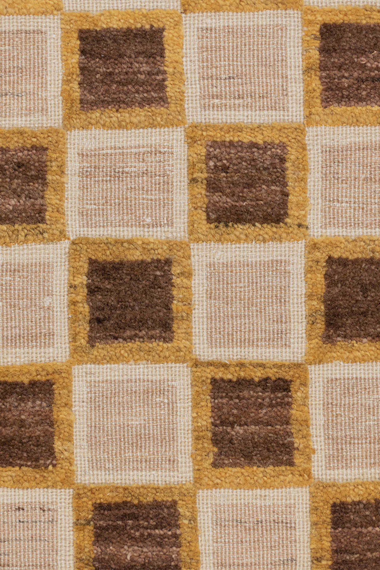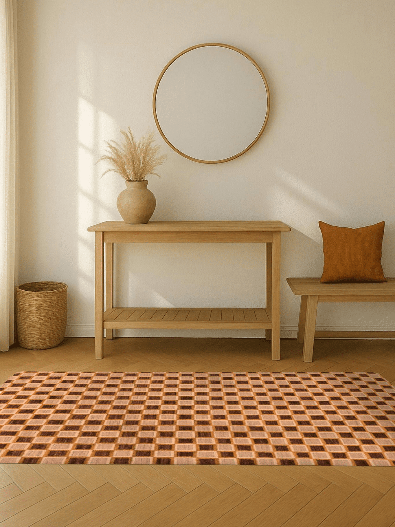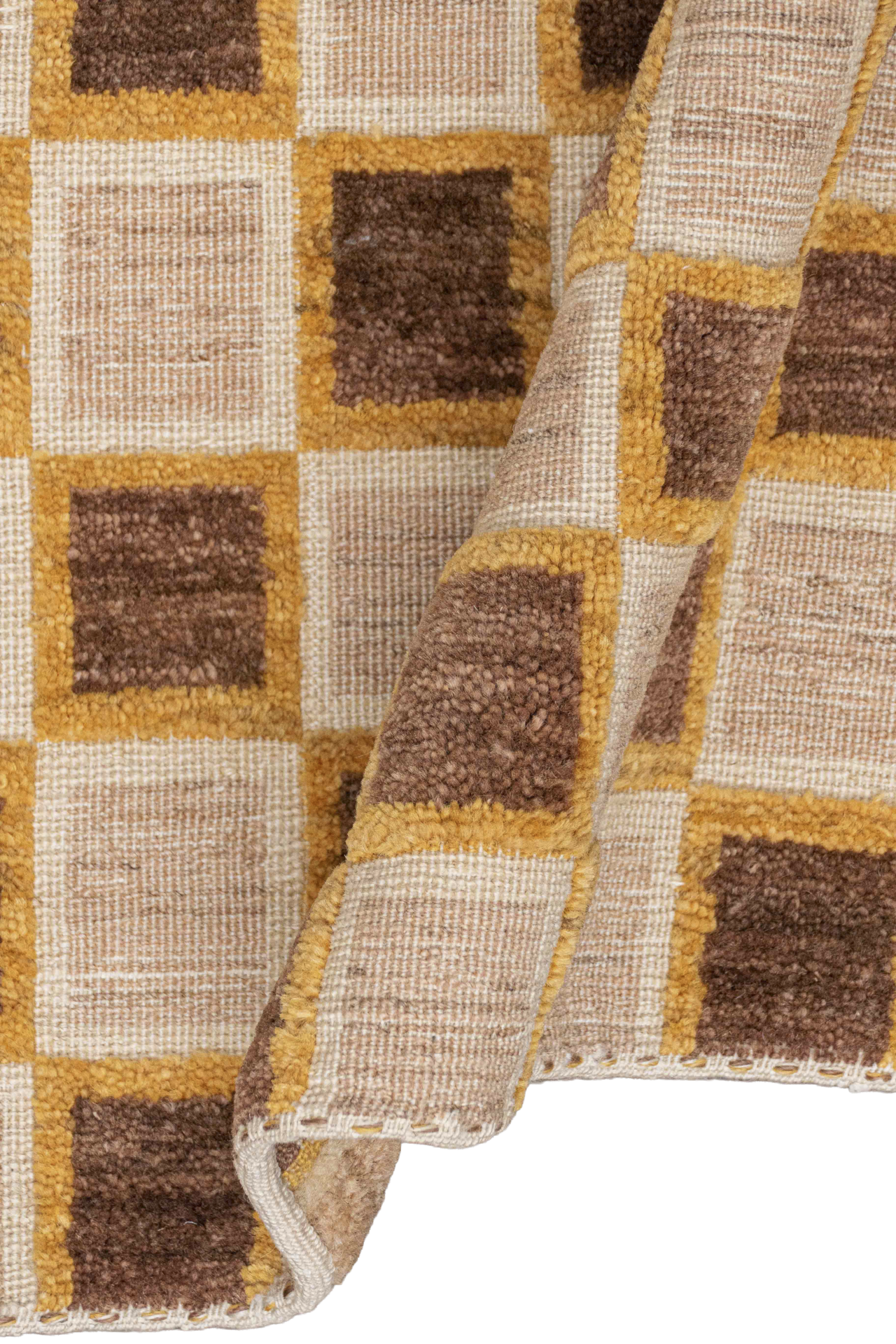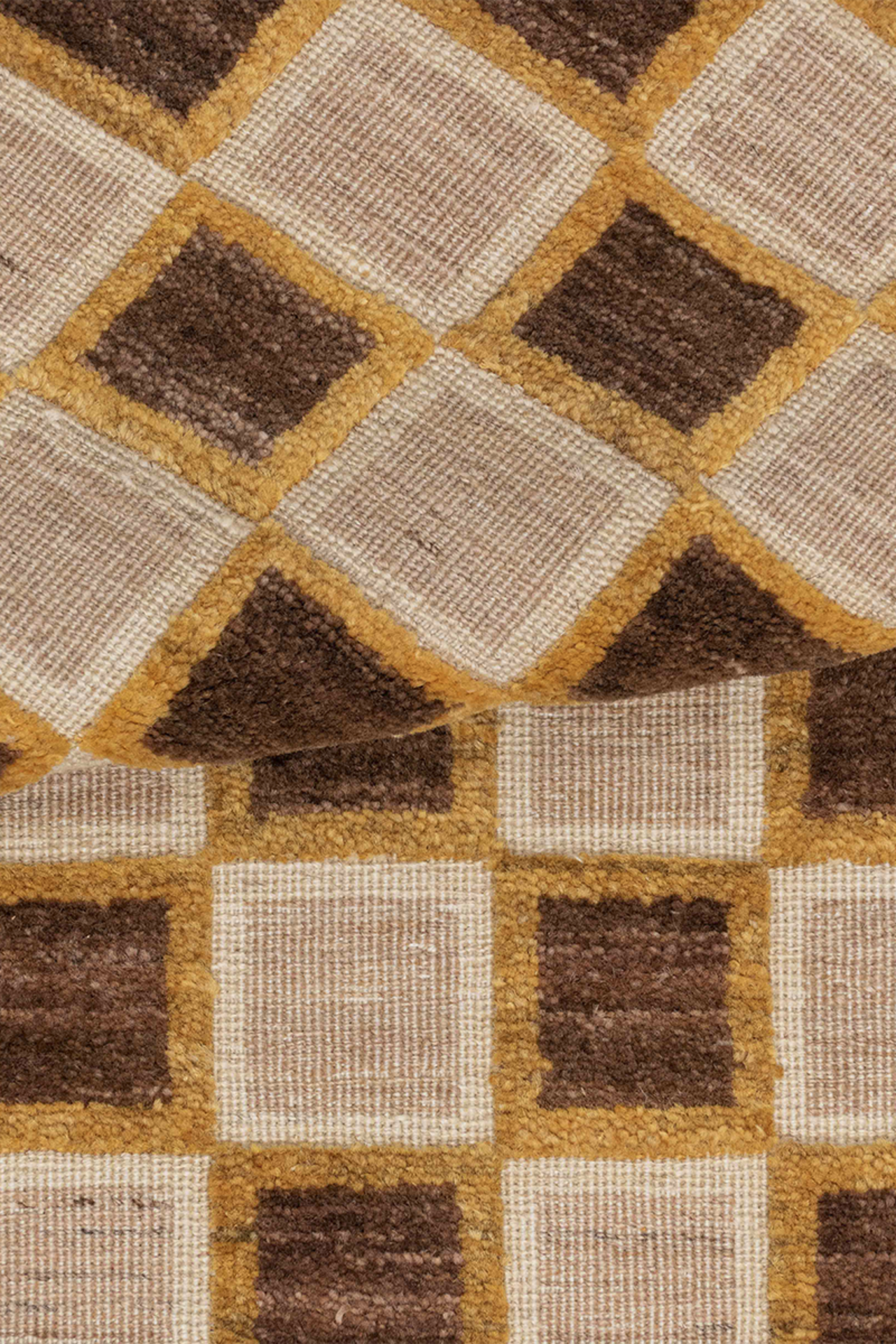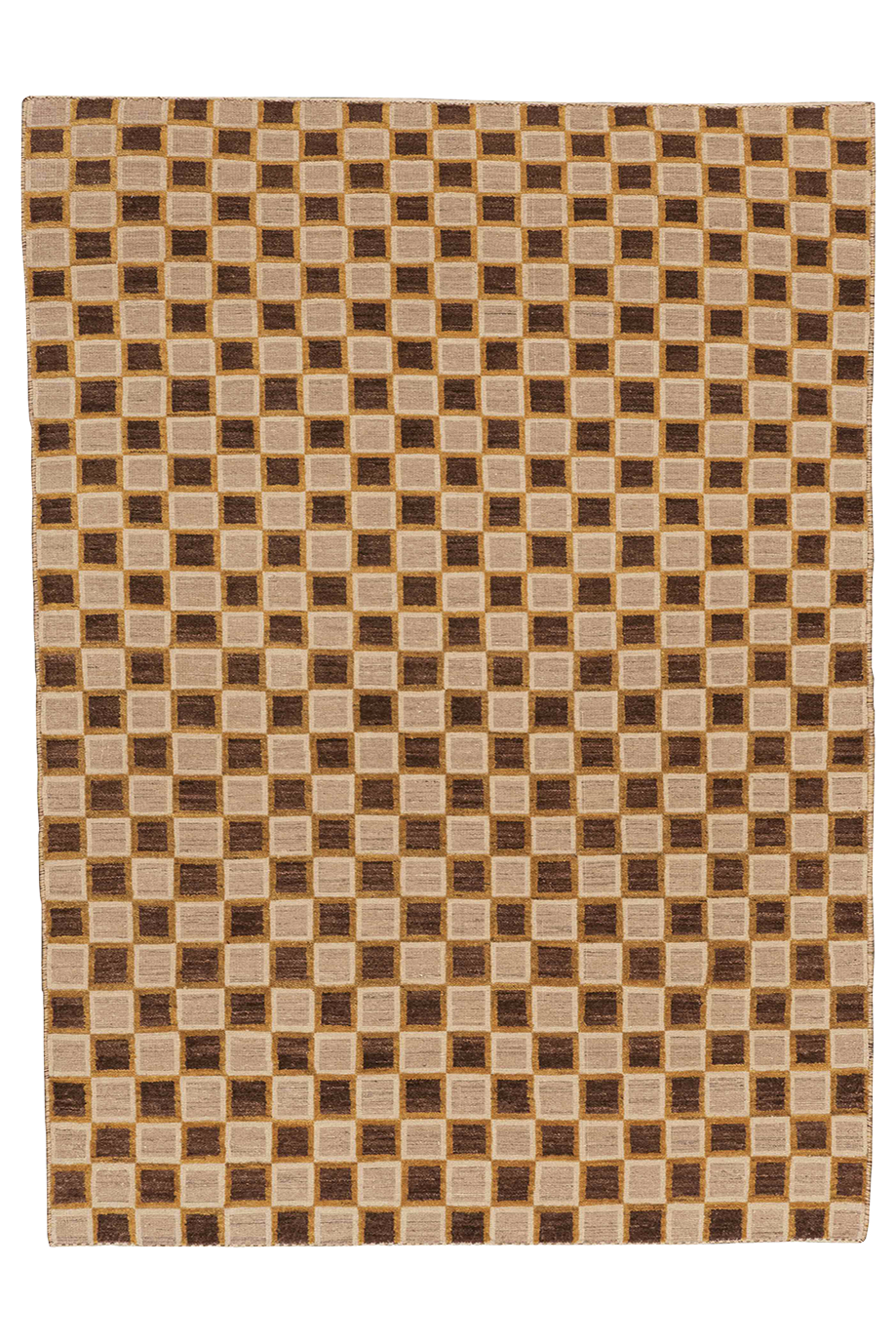 „Wechselspiel“ ist ein außergewöhnlicher Nomadenteppich, der durch seine spezielle Knüpf-Webtechnik auf beiden Seiten vollwertig und dekorativ einsetzbar ist. Das regelmäßige Schachbrettmuster in sanften Naturtönen verleiht ihm eine ruhige, rhythmische Ausstrahlung, die sowohl in moderne als auch klassische Interieurs harmonisch eingebunden werden kann.