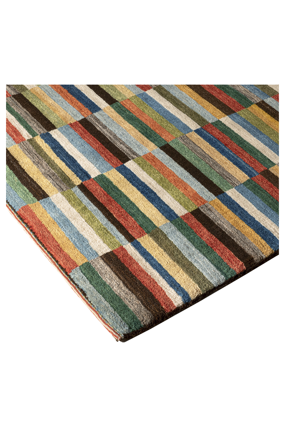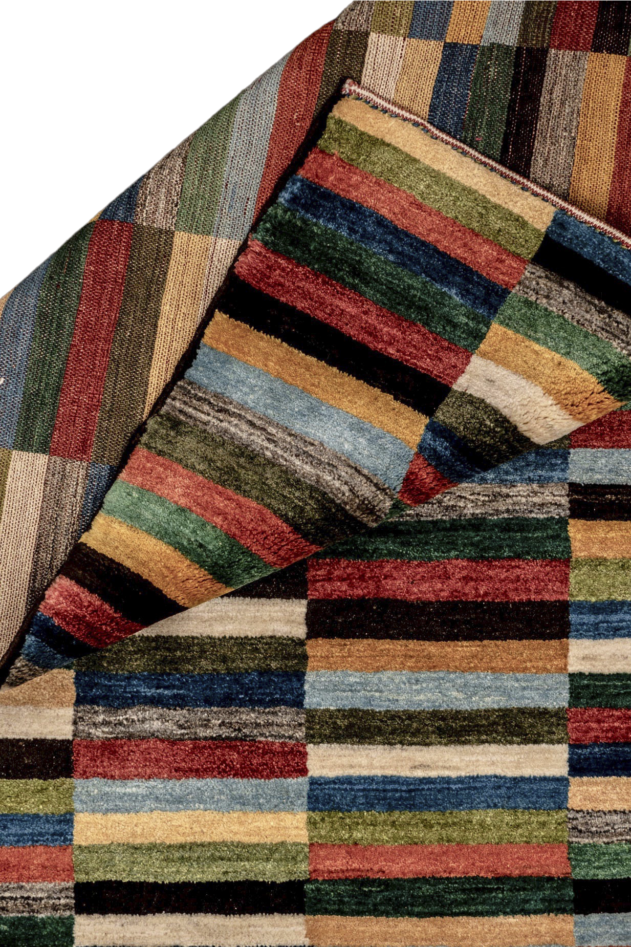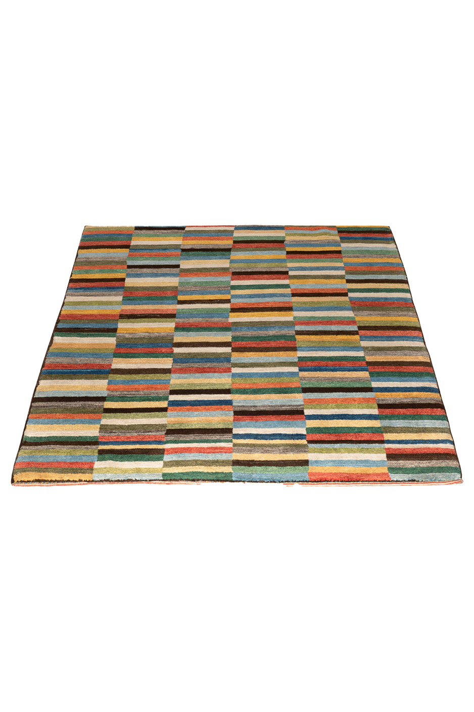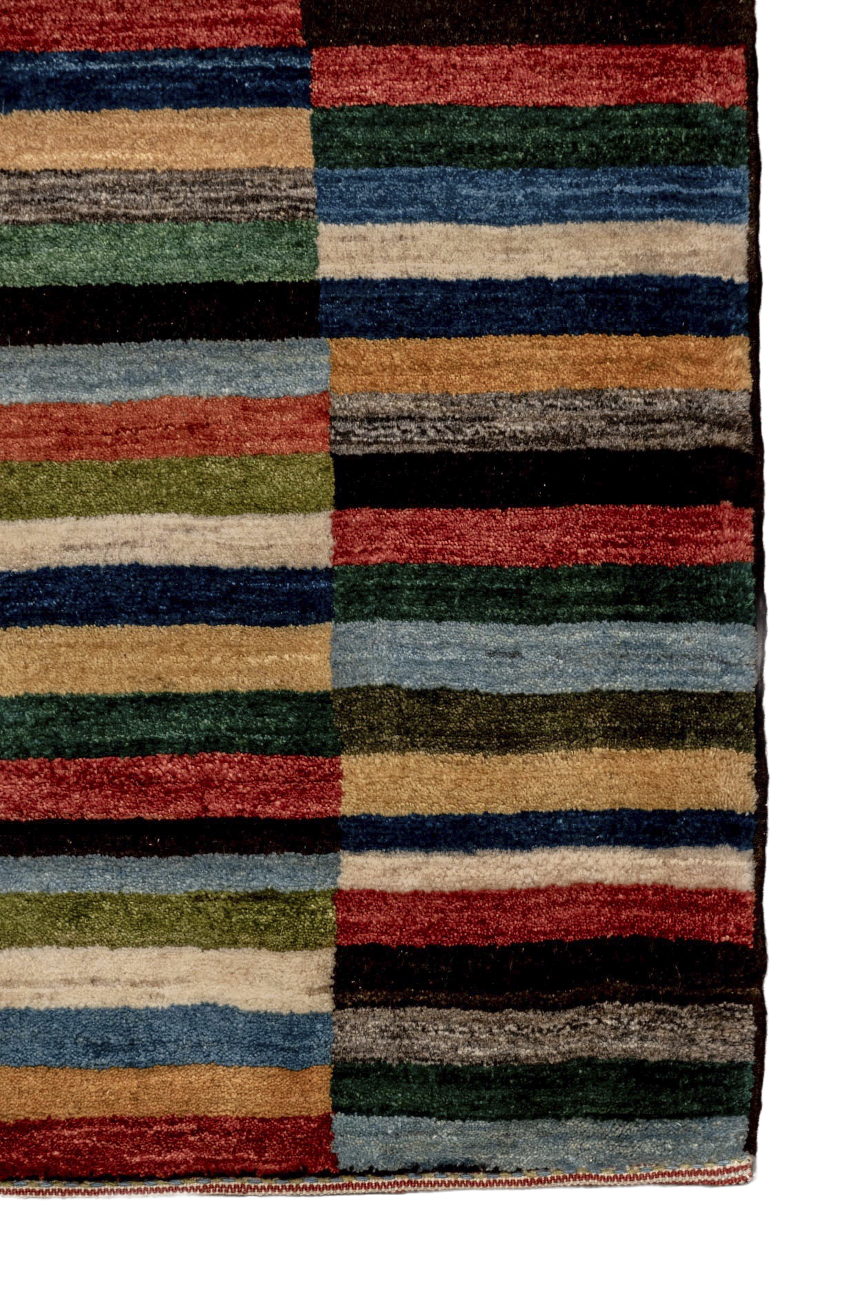 Wie ein lebhaftes Musikstück aus Farben offenbart der Gabbeh-Teppich Farbtanz die Kunstfertigkeit nomadischer Knüpferinnen aus dem iranischen Fars-Gebiet. Aus naturgefärbter Hochlandwolle gefertigt, entfaltet sich auf diesem Unikat ein dynamisches Spiel aus Streifen und Farbtönen – jeder von Hand gefärbt mit natürlichen Essenzen aus Pflanzen, Rinden und Erde.