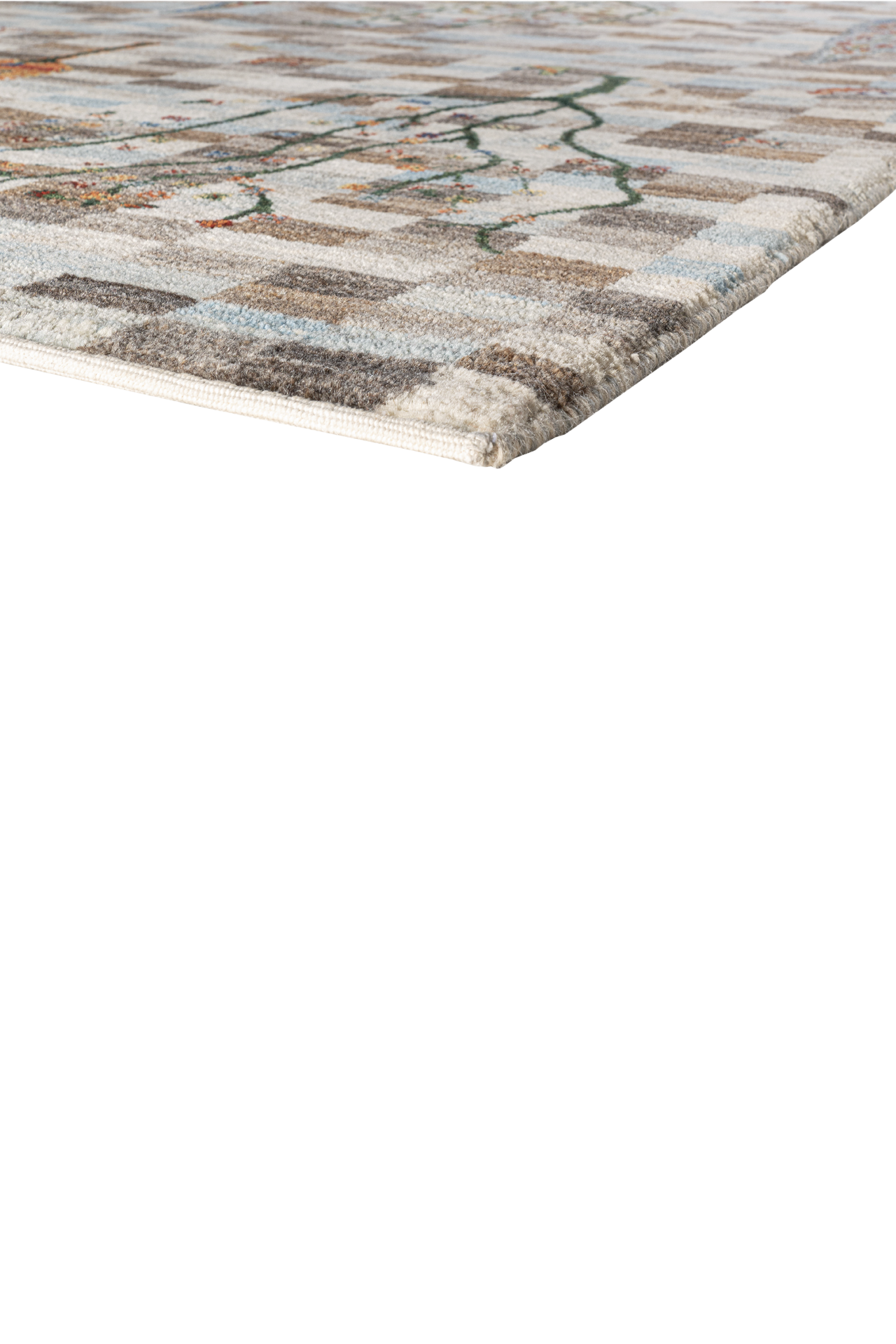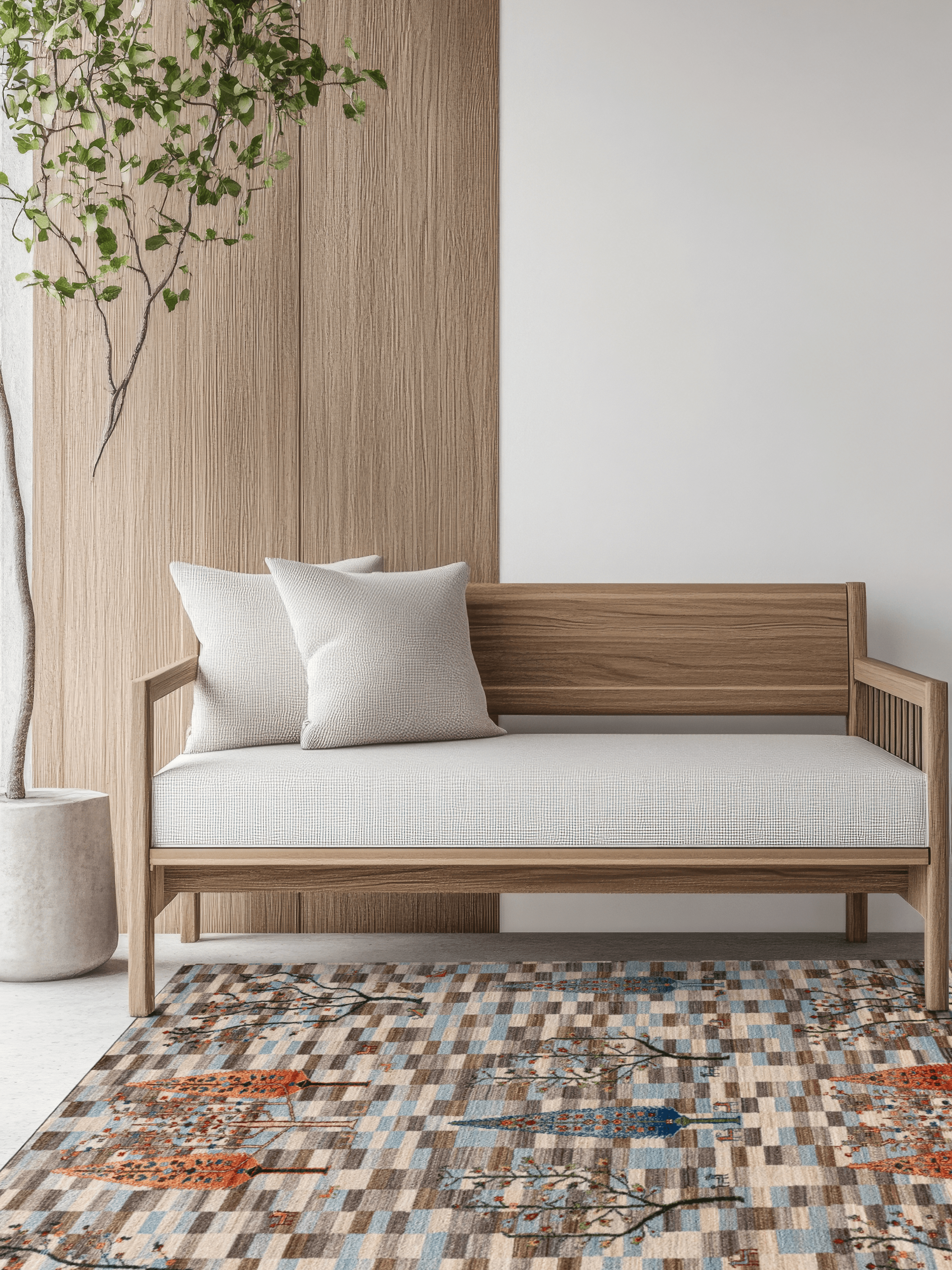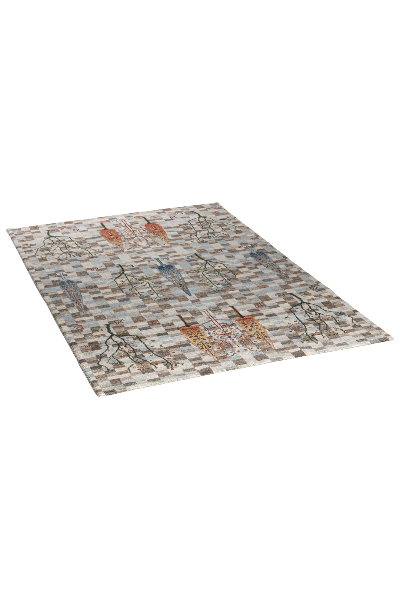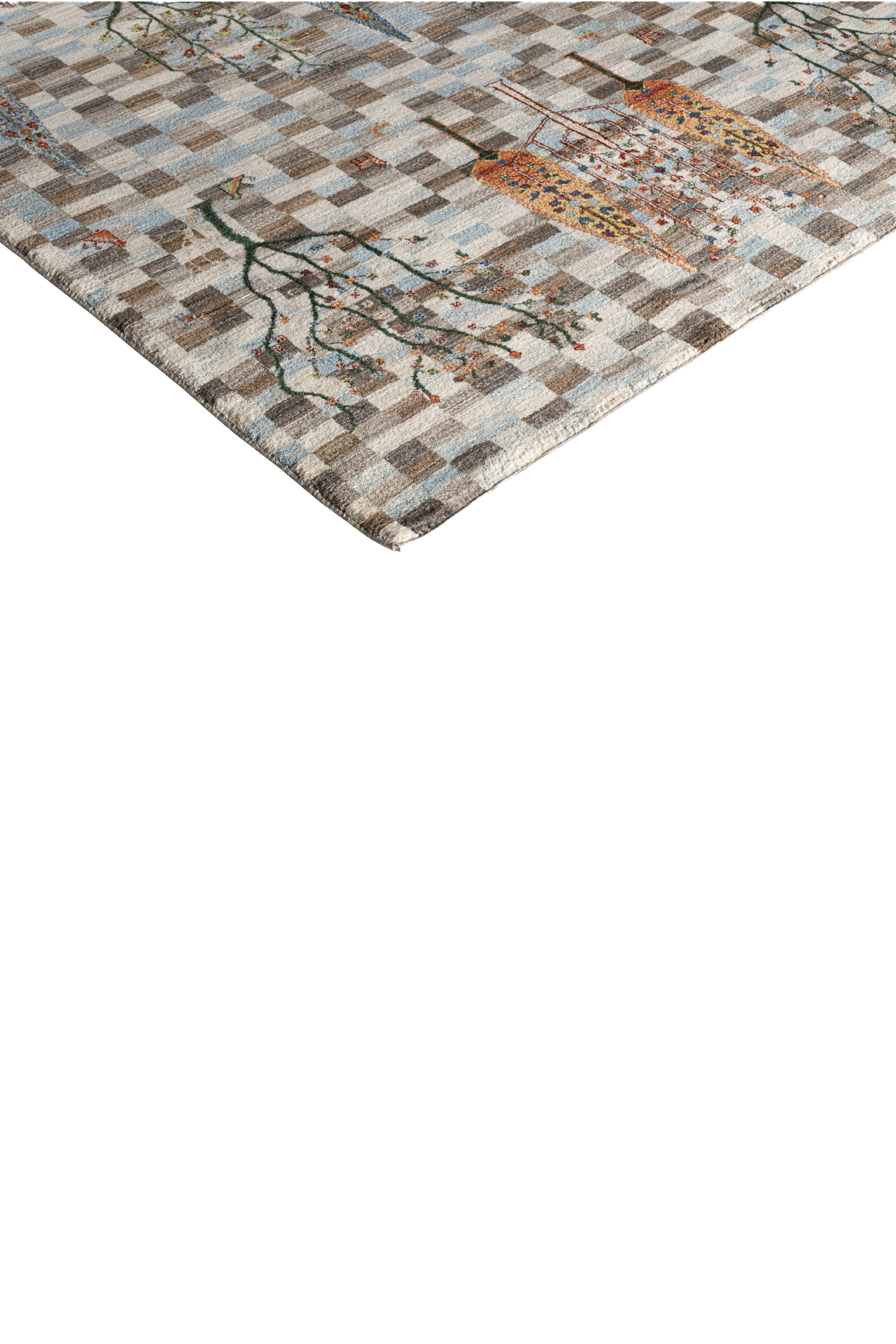 In „Tempel der Zypressen“ wird die Zypresse zur Säule, zur Linie, zum Zeichen. Die streng rhythmisierte Anordnung der leuchtenden Bäume – eingebettet in ein fein abgestuftes Schachbrettmuster aus Naturtönen – verleiht diesem Teppich eine fast meditative Klarheit. Die Komposition erinnert an einen alten, stillen Tempelgarten, in dem die Natur zur Architektur wird.