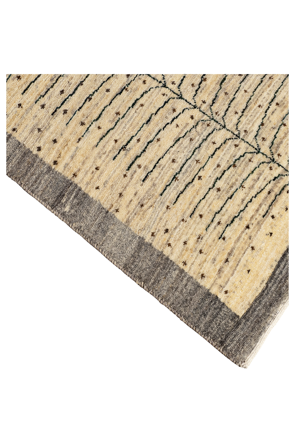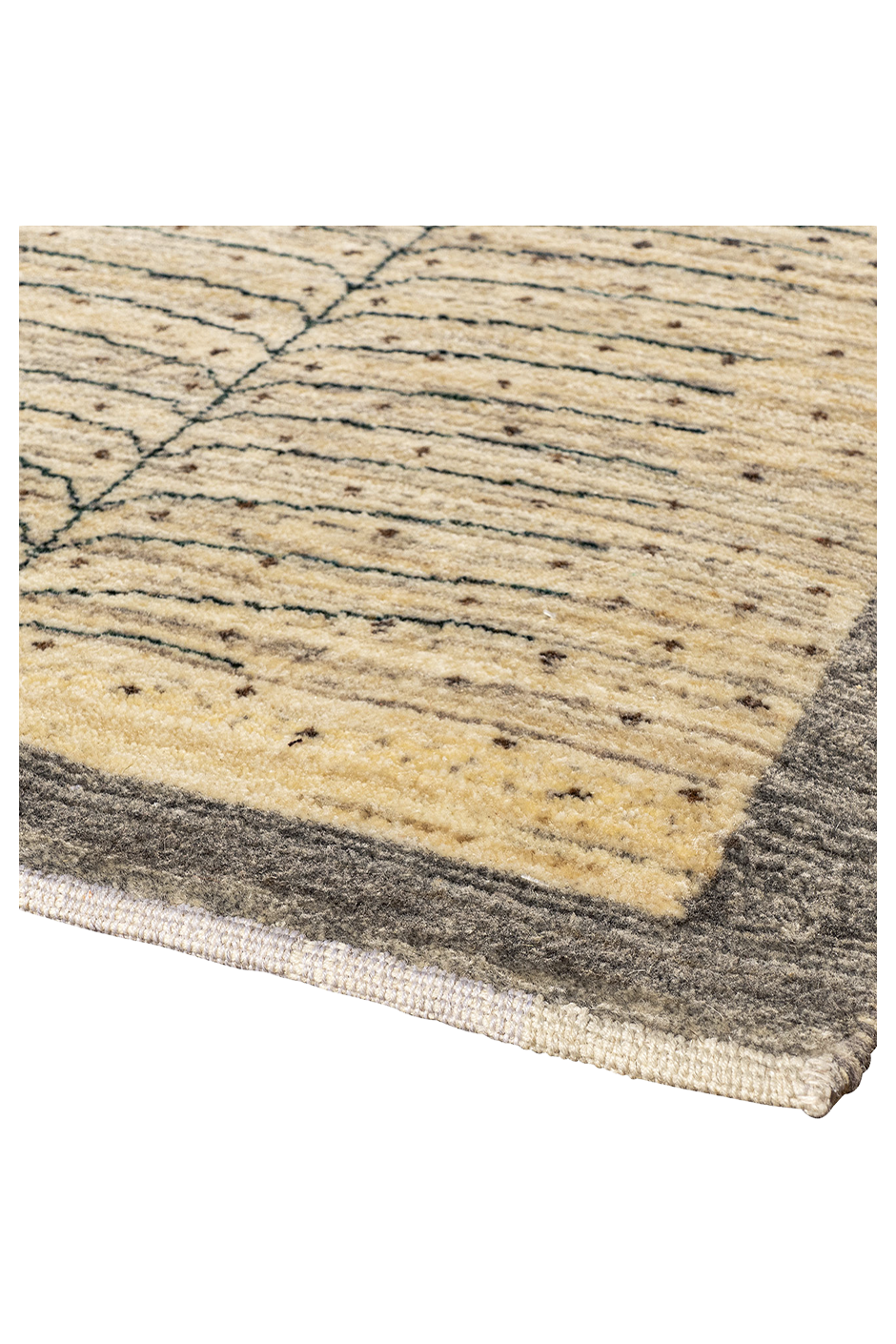 Das zentrale Motiv dieses Teppichs ist ein filigraner Lebensbaum mit einem feinen, zarten Stamm. Seine ebenso feingliedrigen Äste stehen symbolisch für die Familie – harmonisch und eng miteinander verbunden. Dieses bedeutungsvolle Design verleiht dem Teppich eine elegante, poetische Ausstrahlung.
