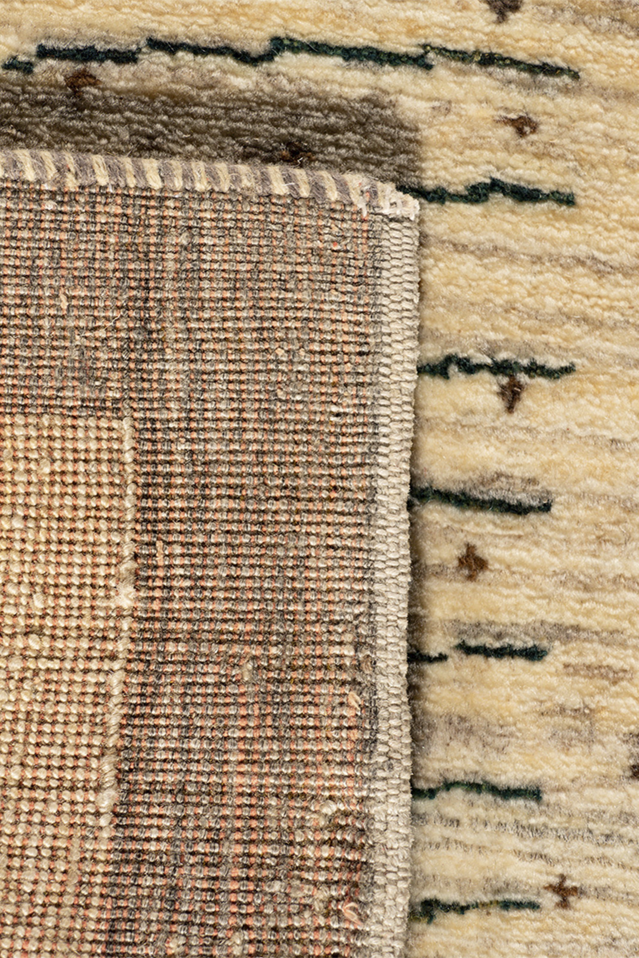 Dieser abstrakte Nomadenteppich ist ein originaler Gabbeh-Teppich aus dem Iran. Er wurde in aufwendiger Handarbeit aus feinster Hochlandwolle der Fars-Region geknüpft. Die geschmeidige Wolle wird traditionell von Hand kardiert und gesponnen, was ihre außergewöhnliche Qualität und Langlebigkeit sichert.