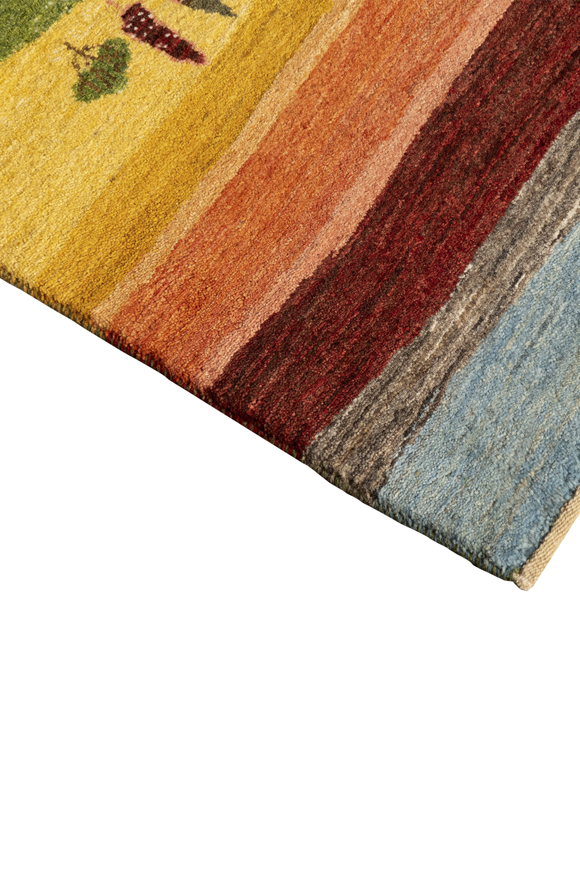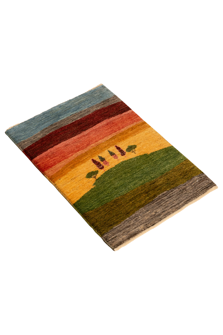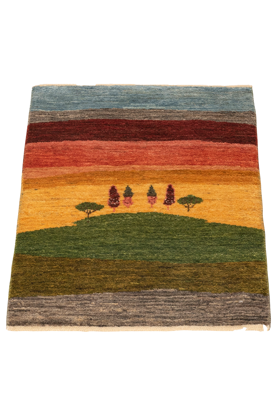 Das Design des Teppichs zeigt eine bunte Hügellandschaft, die in verschiedenen Farben dargestellt wird. Im Zentrum der Szene befindet sich eine kleine Baumoase, die einen friedlichen und naturverbundenen Eindruck vermittelt. Nomadenteppiche sind ein wahrer Ausdruck der Kunst und Seele der Nomadenstämme, die noch immer im Zagros-Gebirge der Fars-Region leben. Die Wolle ist mit natürlichen Farbstoffen aus Wurzeln und Pflanzen gefärbt, was dem Teppich seine warme und authentische Ausstrahlung verleiht.