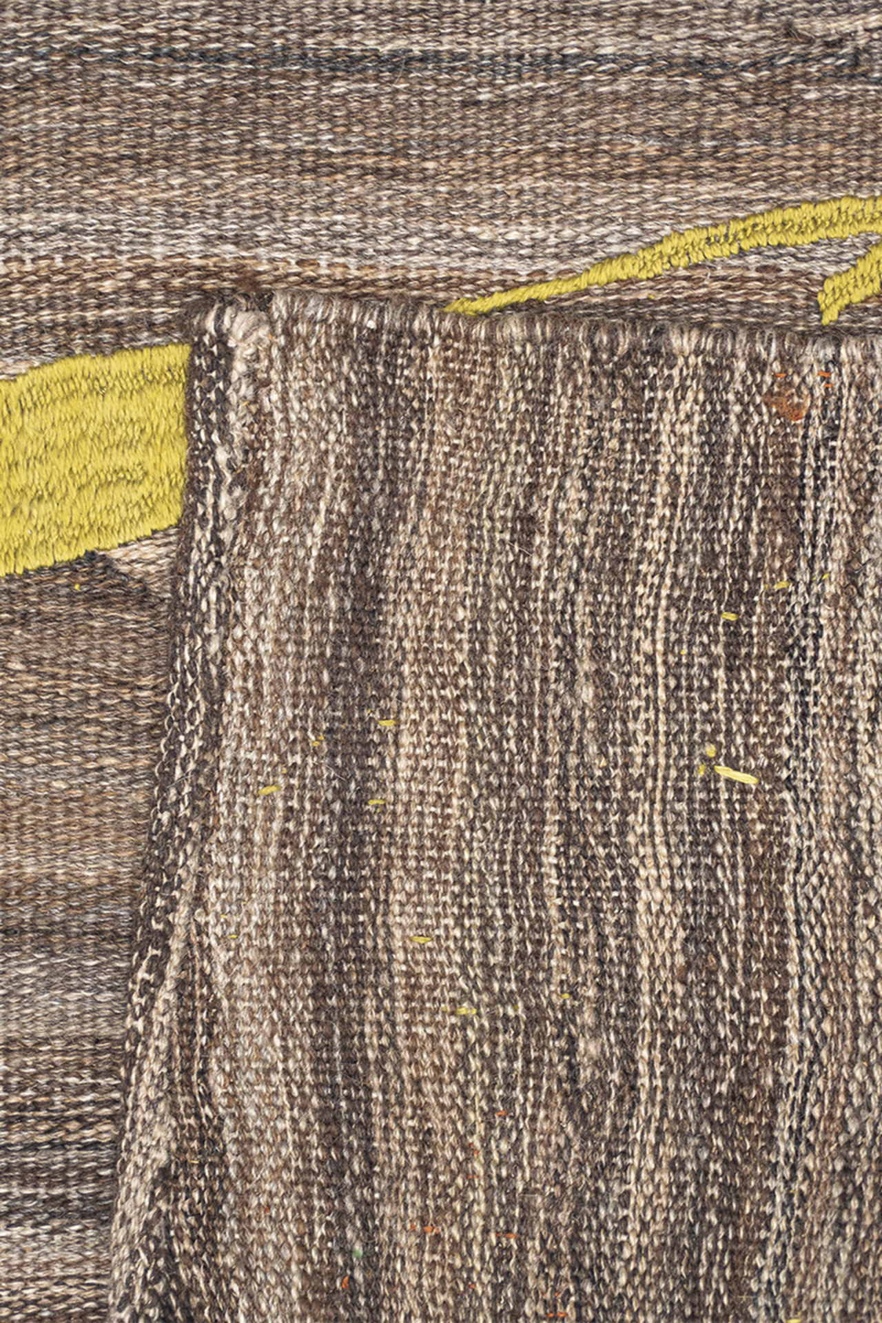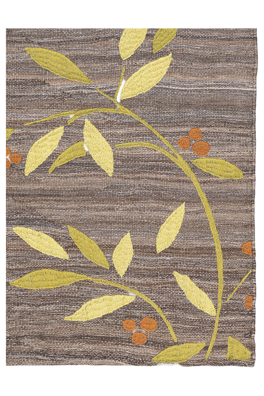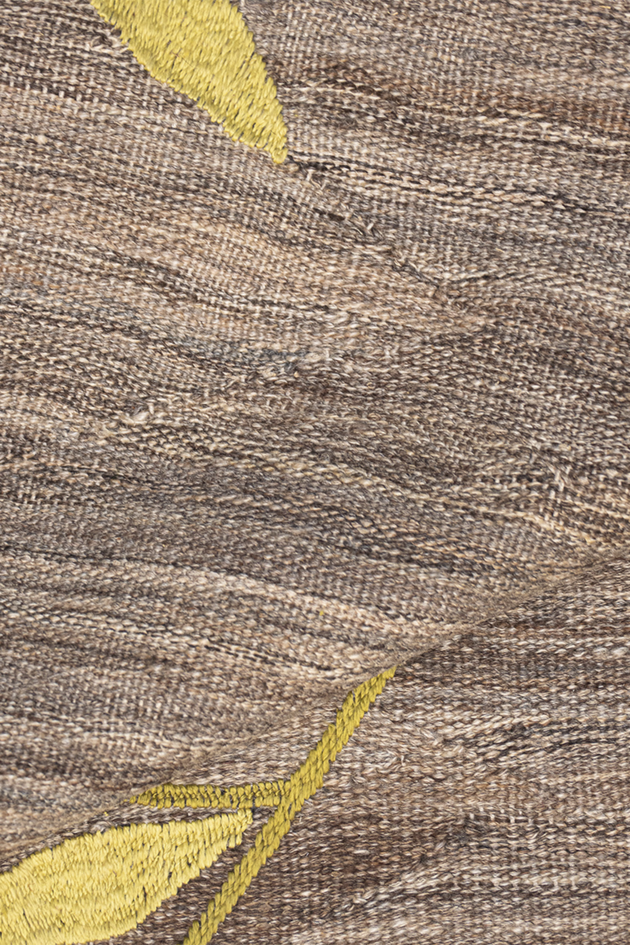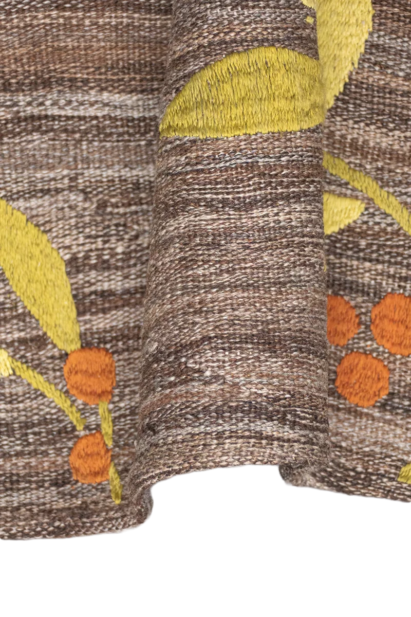 Dieser besondere Nomaden-Kelim Teppich ist ein Unikat, das aus bester Schurwolle und Naturseide besteht. Die grünen Blätter und orangefarbenen Früchte sind aus Seide auf den Teppich gestickt. Die Künstler knüpfen hier jeden Knoten von Hand und arbeiten mit einer unglaublichen Präzision. Der besondere Kontrast aus Seide und Wolle lässt den Teppich strahlen. Das Unikat wurde mit reinen Naturfarben gefärbt, die aus Pflanzen und Rinden gewonnen wurden. Diese Art der Kelim Teppiche ist besonders rar und selten, weshalb dieses Unikat noch einzigartiger ist. Aufgrund des hohen Restfettgehalts in der Schurwolle ist das Unikat besonders unempfindlich und strapazierfähig.